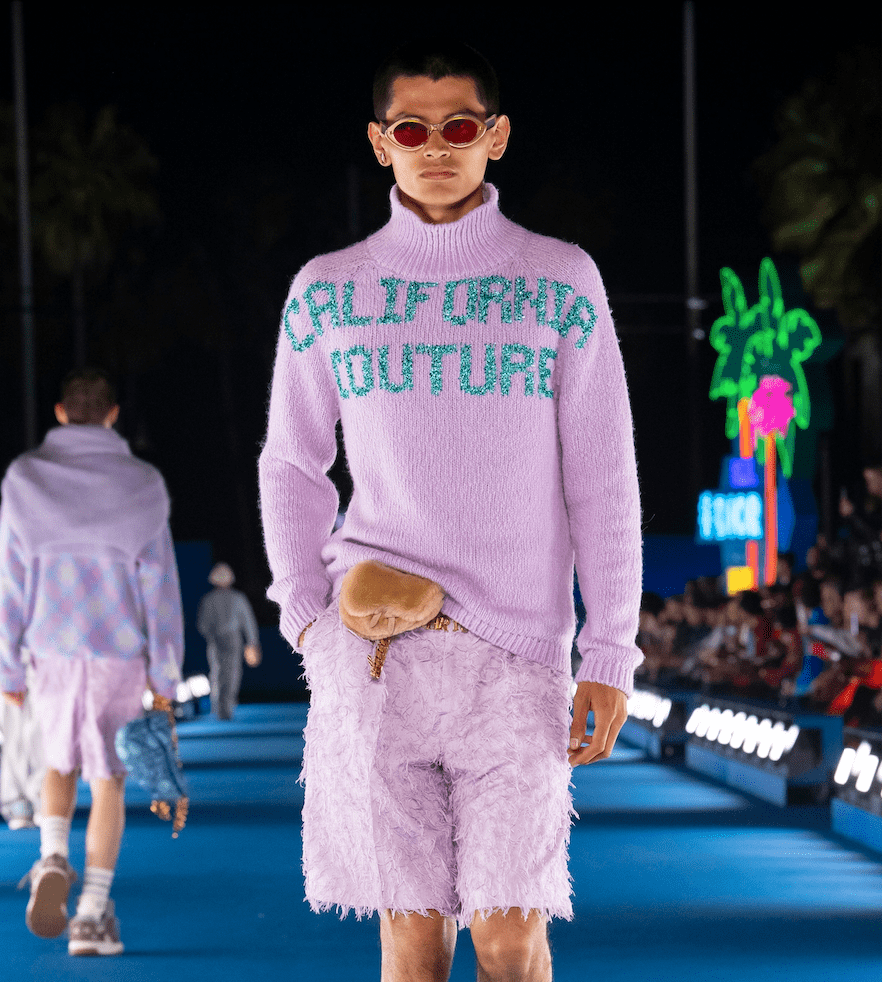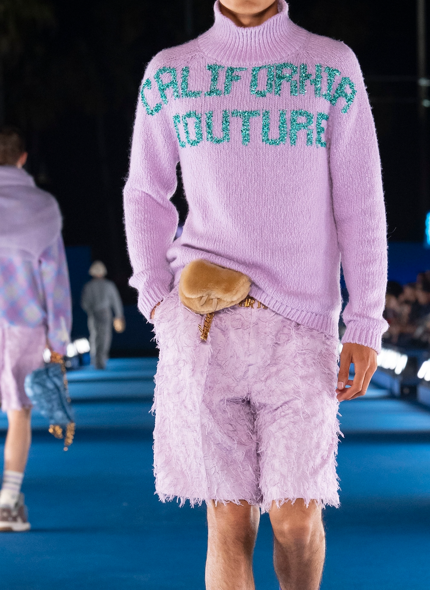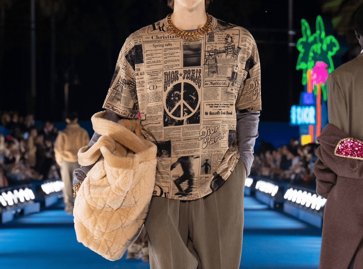 Не обошлось и без кодов Dior. Пиджак 1947 года Bar стал частью теперь и мужского гардероба. Он был выполнен из шелка, что придало ему лощеный вид. Также Линнетц решил адаптировать культовый газетный принт Джона Гальяно, включив в него собственные фотографии, объявления 1970-х годов и объявление 1905 года о создании Венис-Бич. В поп-культуре газетный принт прославился после того, как в платье Dior Кэрри Брэдшоу просила прощения у бывшей мистера Бига за то, что разрушила их отношения (и сломала ей нос).