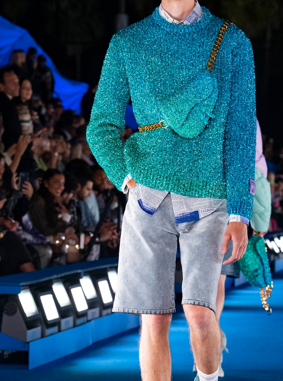Основа круизной коллекции Dior Men — комфортная одежда для жизни у океана: свитеры в стиле гранж, толстовки, кроссовки для скейтбординга с яркими шнурками в эстетике нулевых, джинсовые шорты, а также шорты словно украденные у серферов. Все это украшено сложной вышивкой, перьями, пайетками и градиентным окрашиванием.