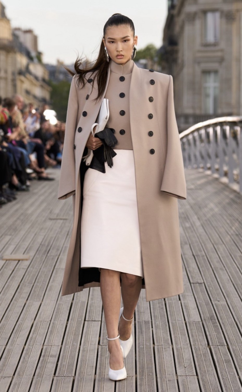 Длинные пальто с завышенными лацканами и короткие двубортные пиджаки, соблазнительные юбки-карандаши в сочетании с корсетными топами и перчатки, которые модели несли в руках, — каждый образ излучал сдержанность наряду с откровенностью. Стоит отметить и сублимацию женского тела — изделия словно «обволакивали» тела моделей, а каждый изгиб получил новое прочтение.