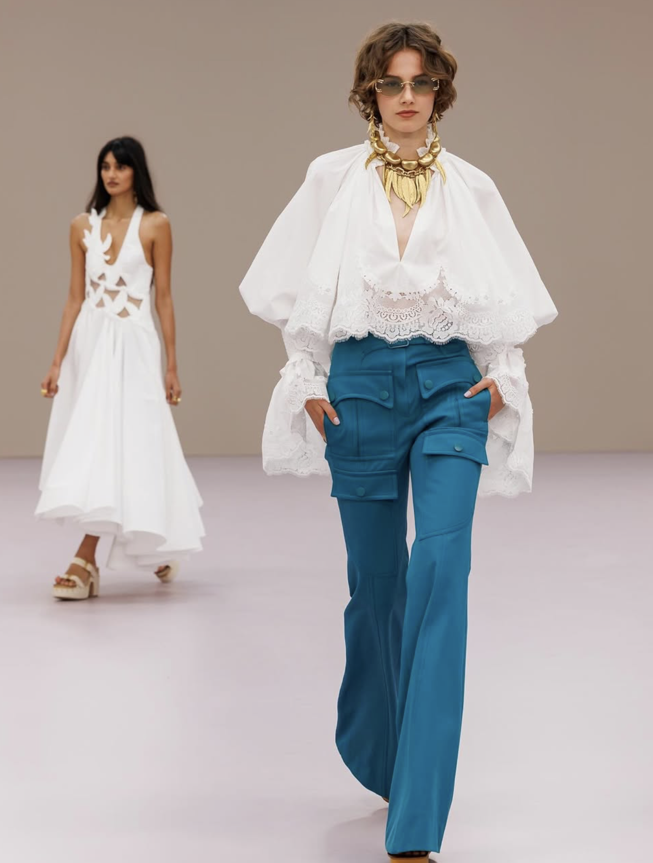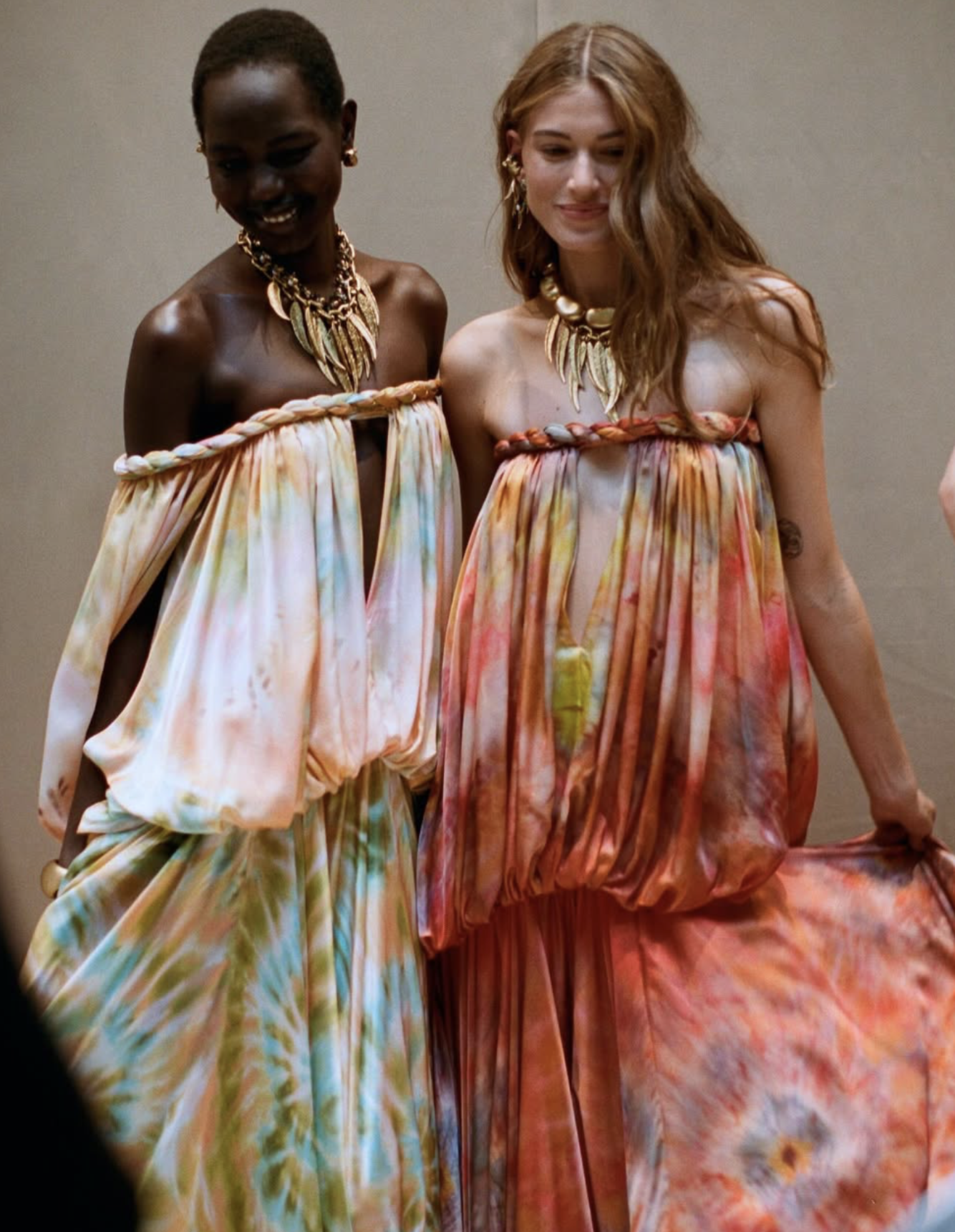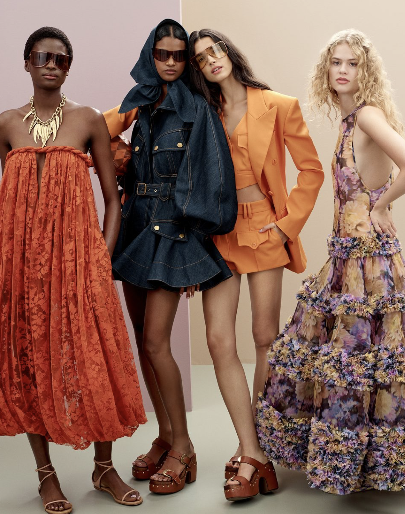 Циммерманн бережно перевела эстетику 70-х на язык современности. Вместо тяжеловесных силуэтов — невесомость, вместо ностальгии — жизнь в моменте. Платья из шелка и органзы словно «плыли» вокруг тела, а многослойные воланы и пышные рукава придавали образам легкость, в то время как асимметричные подолы напоминали волны на заливе.