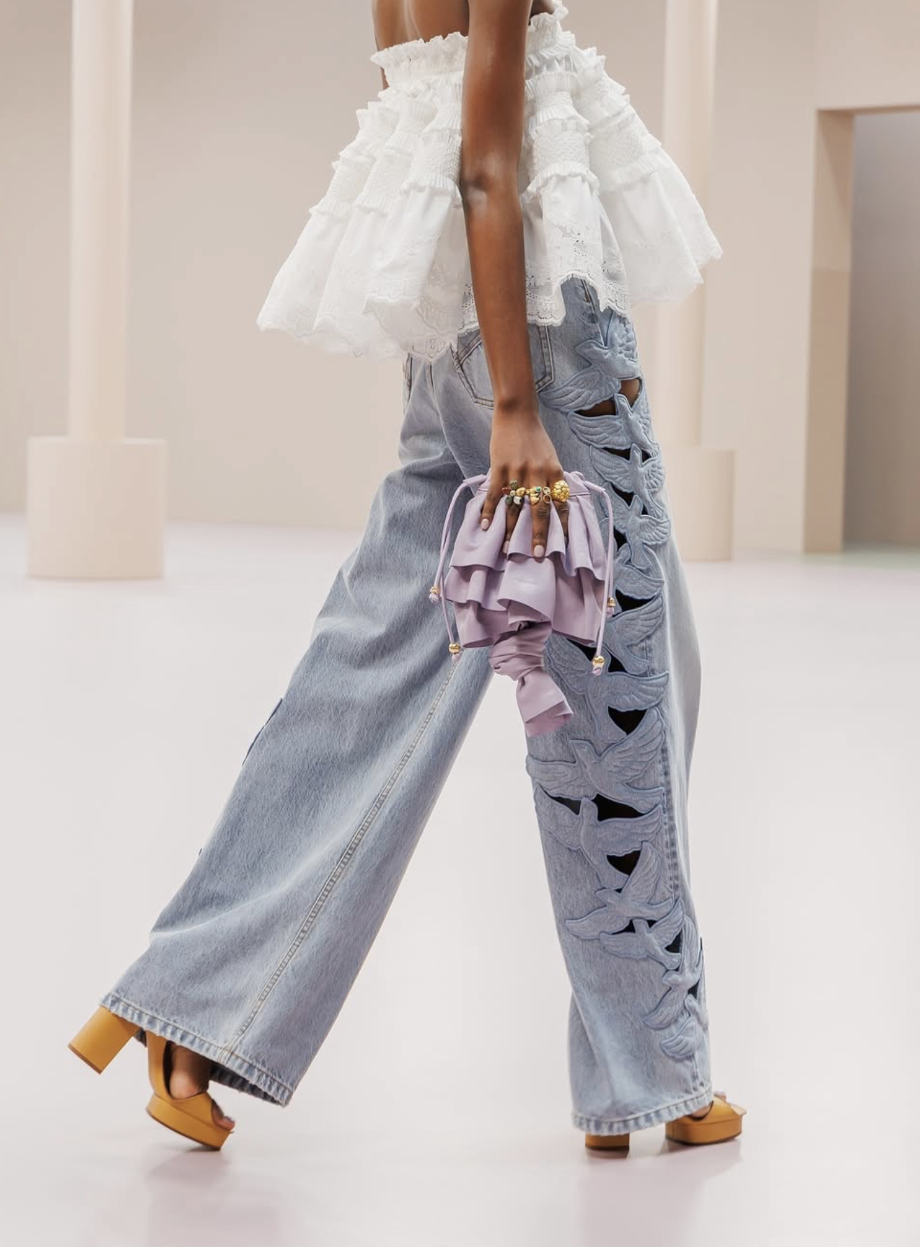 Даже деним, который мы привыкли видеть плотным и утилитарным, в этой коллекции обрел совершенно новое звучание. Вышитые (а порой вырезанные) птицы привносили игривости в образы.
