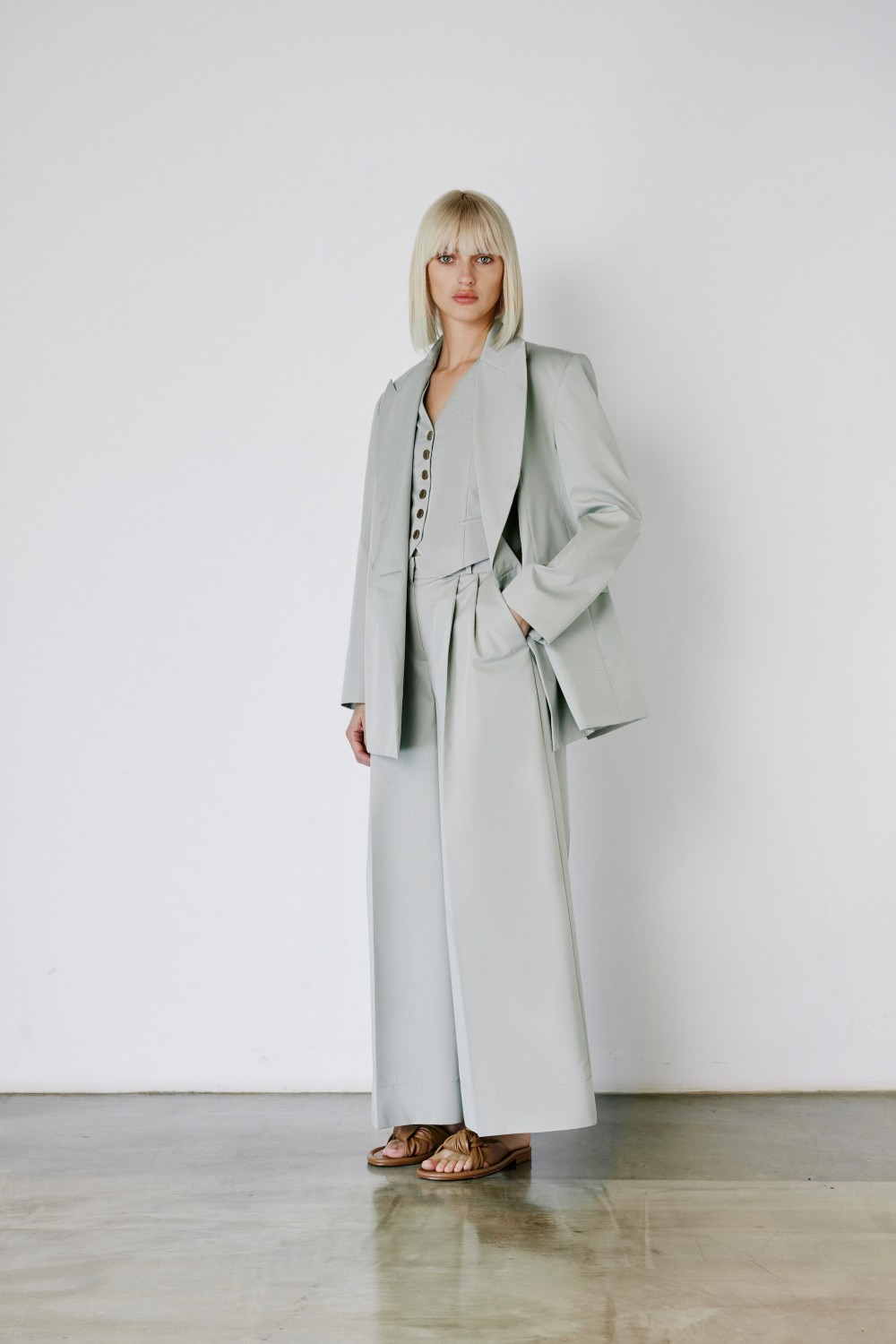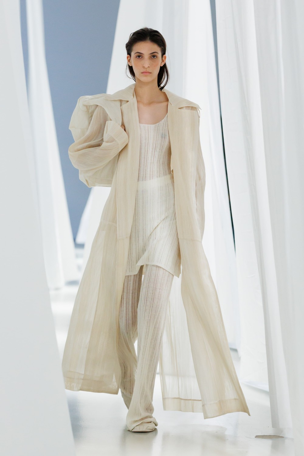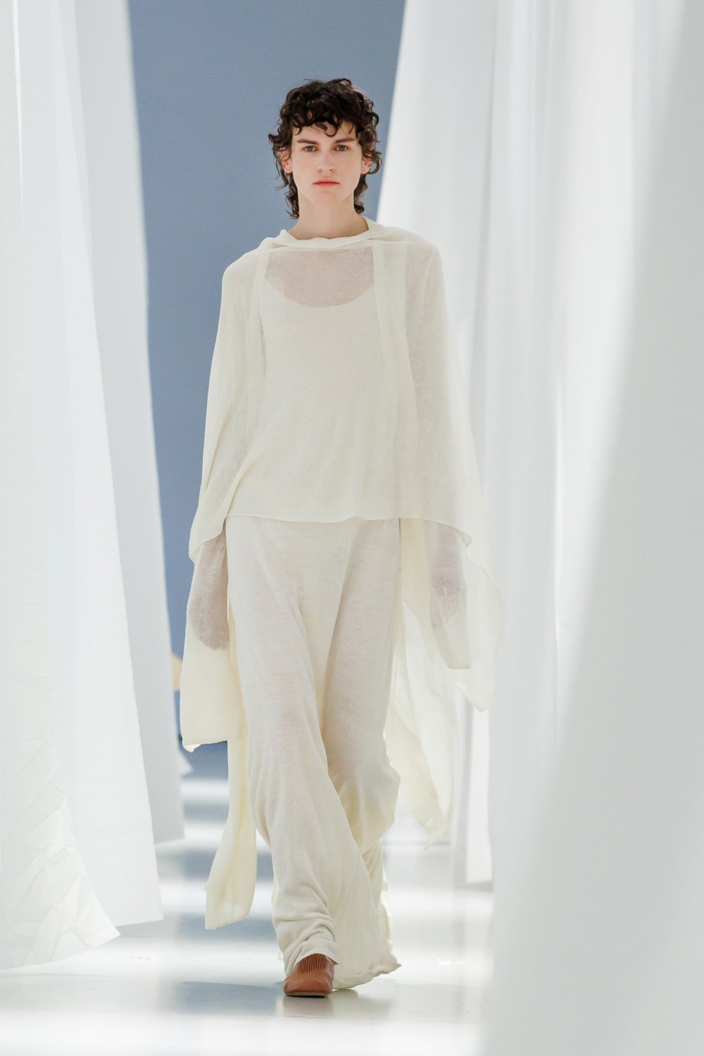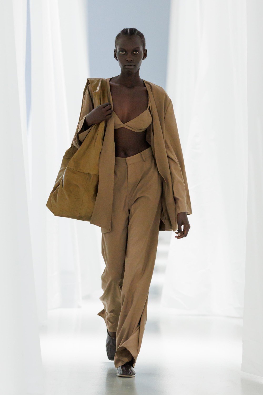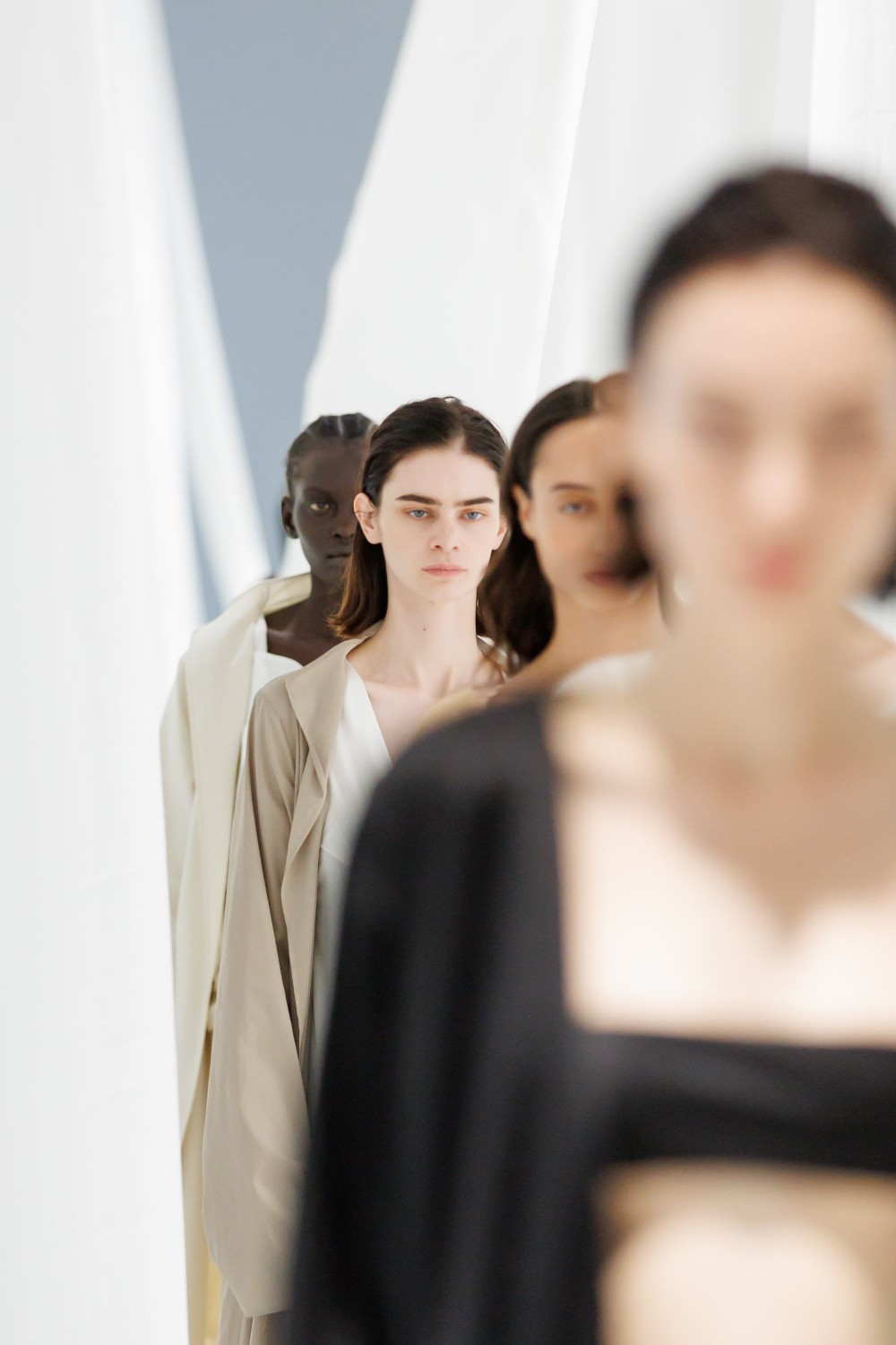 В коллекцию вошли: струящиеся брюки, стильные костюмы, облегающие платья, невесомые кофты и жакеты. От каждого образа на показе веяло непринужденностью — все благодаря объемности, земляной цветовой палитре и прозрачным материалам.