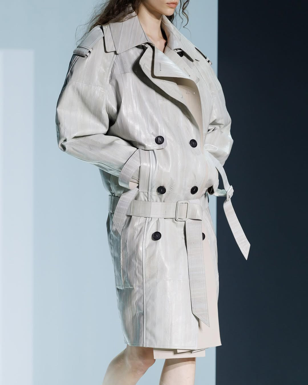 Она выходит из дома в длинном тренче цвета мокрого асфальта. Воротник поднят, плечи четко обозначены, шаг твердый. Но стоит ей повернуться спиной — и ткань открывает линию талии, словно случайный жест и приглашение к тайне. Она идет по улице в строгом графитовом костюме (тусклом, как утро понедельника). Но пуговица на пиджаке застегнута (или вовсе нет) так, что обнажает кружевной лифчик, и офисный серый вдруг превращается в язык соблазнения.