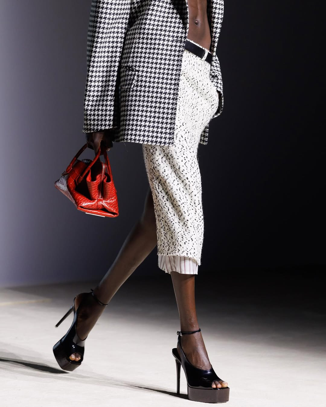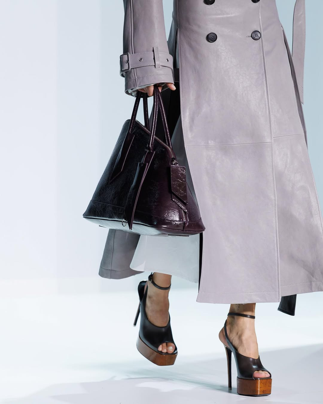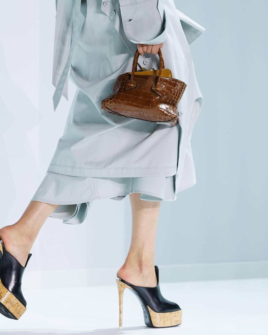 На вечеринке она появляется в полупрозрачном платье, увитом черными перьями по спирали, а в кафе сидит, играя каблуком туфель на пробковой платформе, будто проверяя баланс между властью и нестабильностью. Ее руки держат крошечную La Passeggiata Mini цвета карамели, и даже аксессуар становится частью характера, продолжением ее натуры.