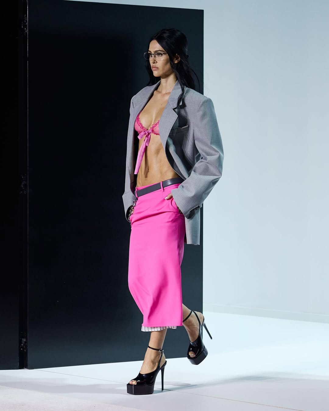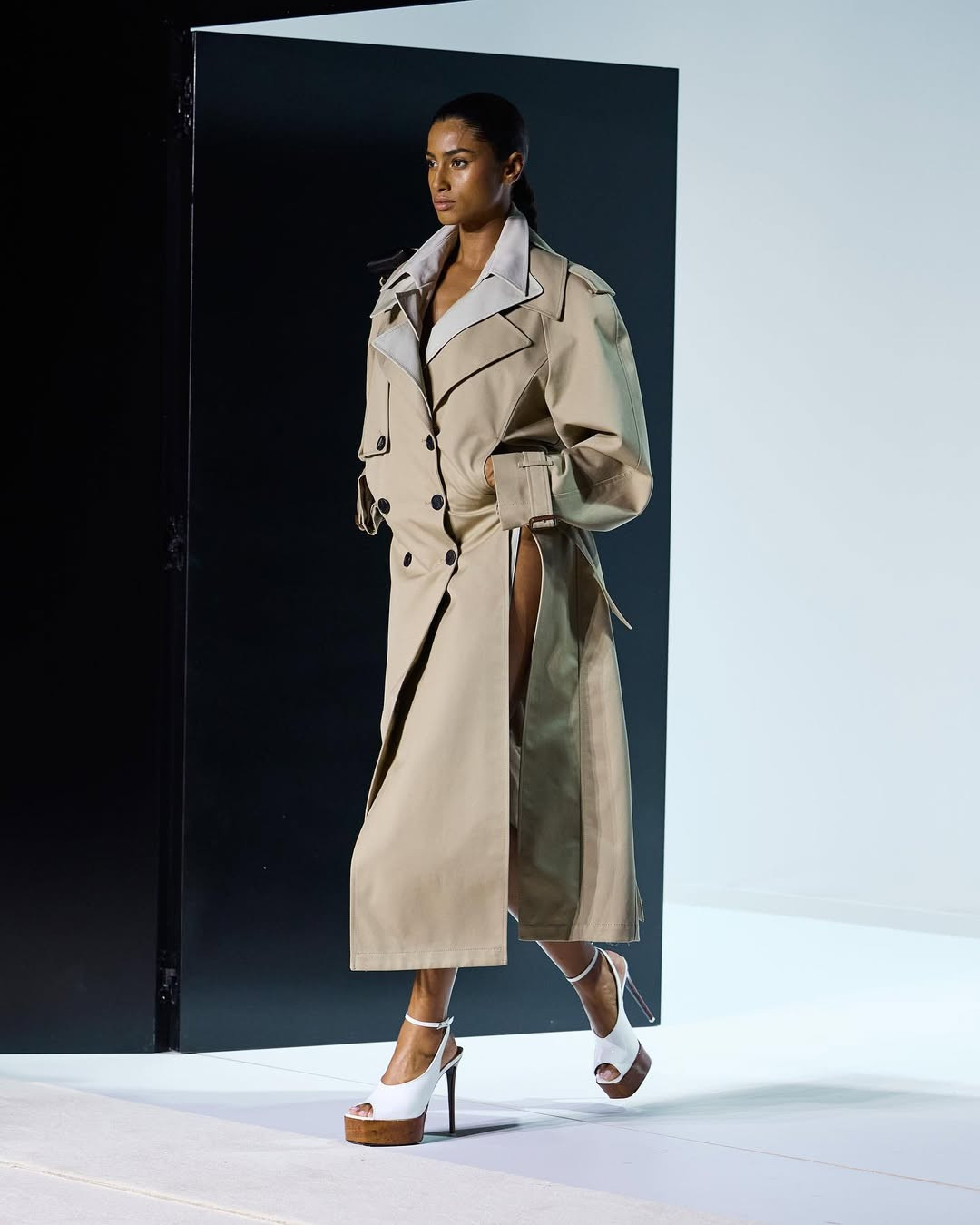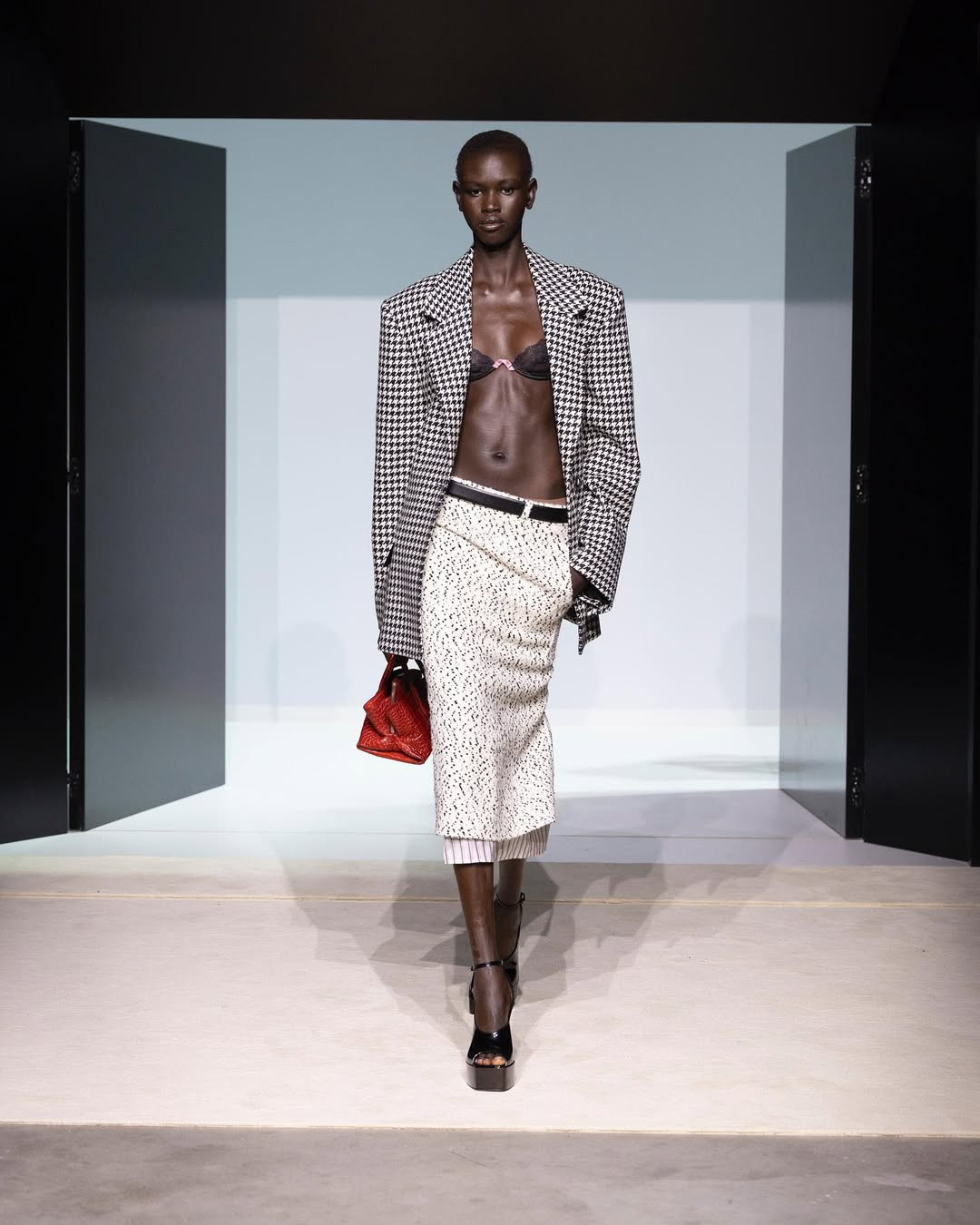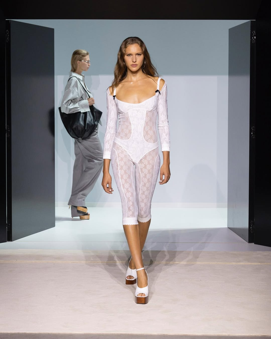 Показ прошел в белом кубе-лабиринте на окраине Милана. Модели двигались сквозь двери и проемы, словно через разные сценарии возможной жизни, а саундтрек с треском и шумами создавал атмосферу нуар-фильма. И действительно, настроение коллекции отсылает к кинематографу. Героиня The Attico сезона SS’26 — не доминирующая, но и неподвластная чужой воле. Она открывает двери без страха и в этом находит свою свободу.