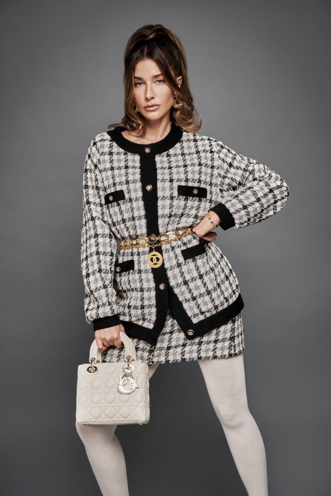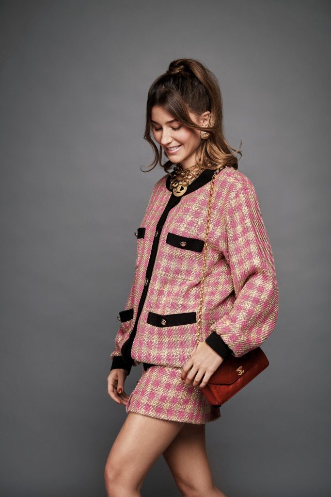 Капсулу дополняют комплекты из твида, кардиганы и юбки. Изделия выполнены в четырех цветовых вариациях: от спокойной серо-белой клетки до розовой с золотом.