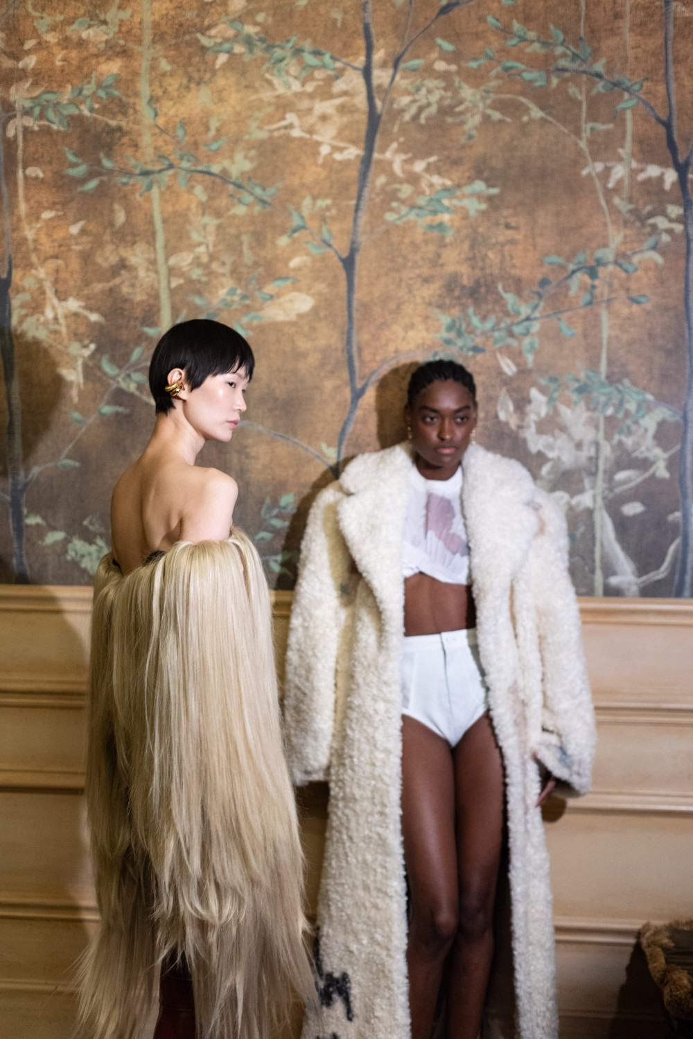 Кристиан Юул Нильсен взглянул на королевский гардероб под новым углом, вдохновившись датскими принцессами Александрой, Дагмар и Тиной, но придал их образам нотку свободы и бунтарства. Бальные платья, когда-то символизировавшие долг и порядок, теперь переродились в игривые юбки с «пузырьковыми» подолами и изящными бантами, а тяжелые силуэты придворных нарядов уступили месту легкости и движению. Особенно нашей редакции полюбилась отсылка к северным пейзажам — искусственные меха с рисунком под рысь и в различных оттенках снега, словно собранные на пути сквозь суровые земли.