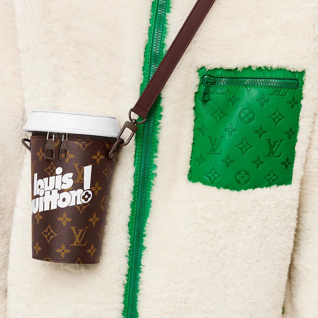 Первый аксессуар представляет собой сумочку в форме стакана для кофе со съемным ремешком, второй — брелок в виде морковки. И сумка и брелок изготовлены из кожи и украшены узором из монограмм модного дома.