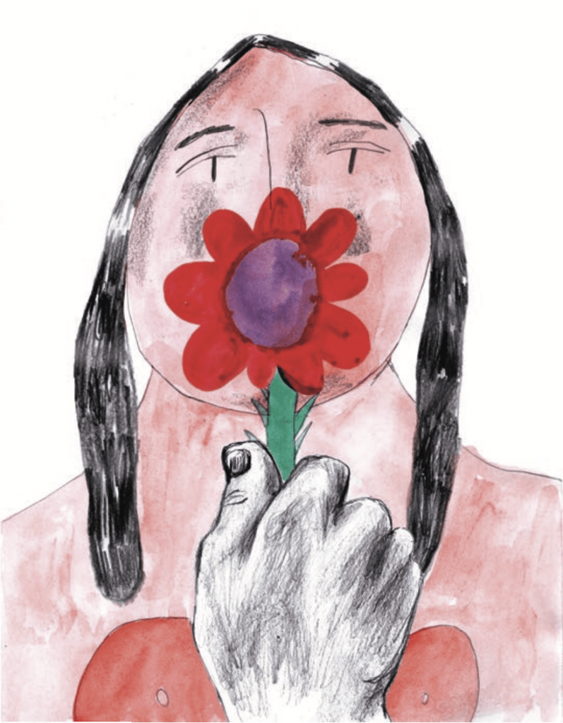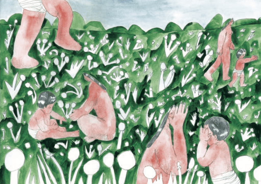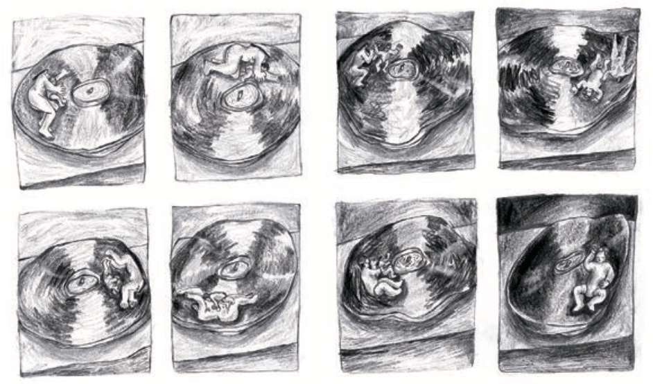 МАДИНА: Представленная на выставке серия графических работ с одноименным названием «Смешанные чувства» стала ядром экспозиции, с нее все началось. Это история про женщину, которая, став матерью, исчезает. После появления ребенка весь фокус как самой женщины, так и общества вокруг смещается на ребенка. Все обращаются на «вы» к этим двум родственникам, спрашивая: «Сколько уже вам месяцев? Вы уже заговорили? Когда вы пойдете в садик?». Героиня зина как будто срастается с ребенком в одно целое. Прототип женщины в этой истории – одуванчик. Этот цветок такой же хрупкий и уязвимый, а форма его похожа на женскую грудь. В самом начале одуванчик пушистый, наполненный, к развязке от него остается только пара пушинок. Так и в материнстве – без поддержки нет сил и времени на здоровую жизнь, тело не принадлежит тебе, память скудеет, ты деградируешь. Без делегирования и помощи извне жизнь напоминает День сурка.