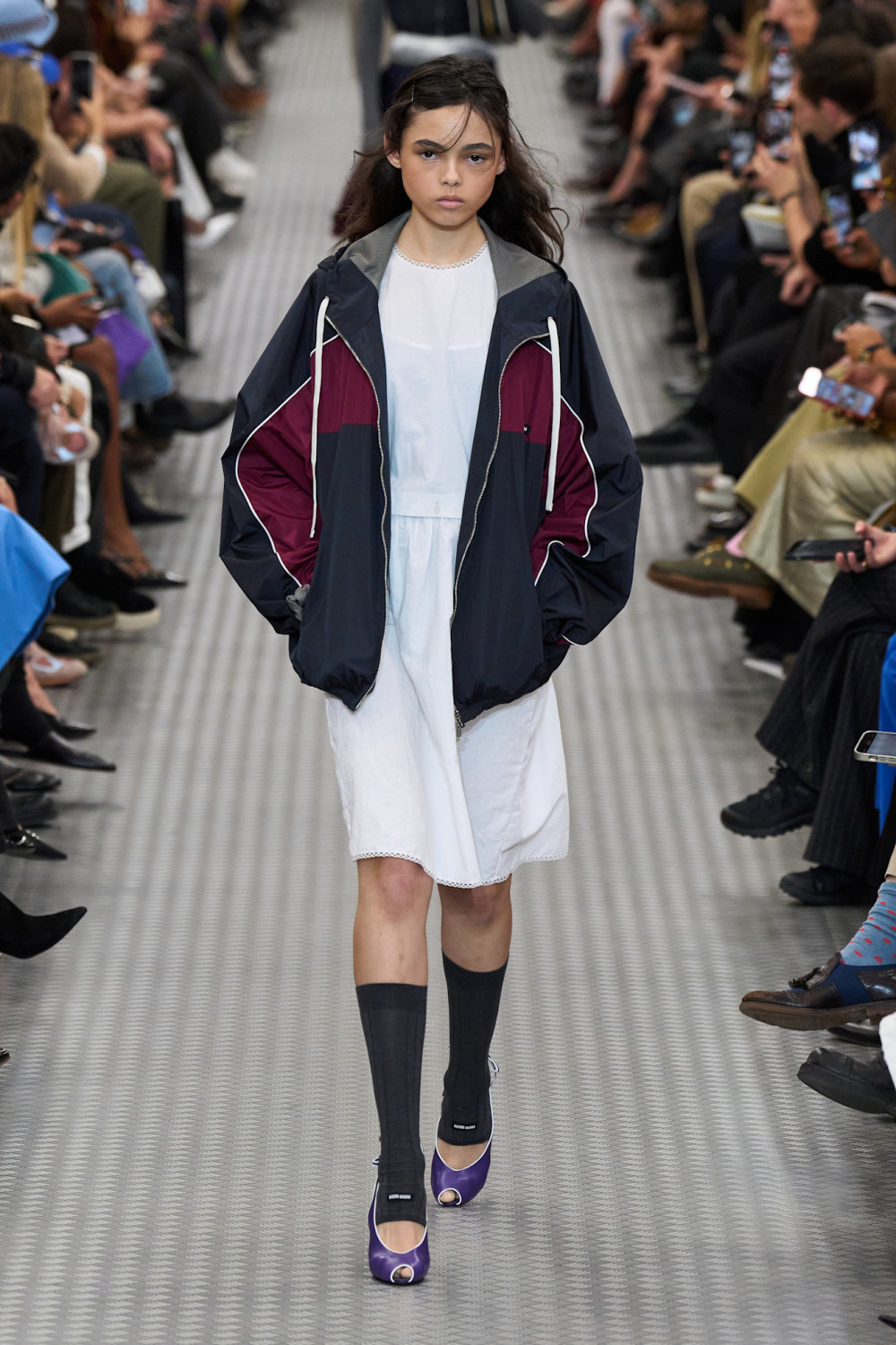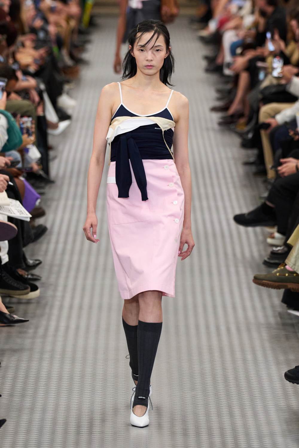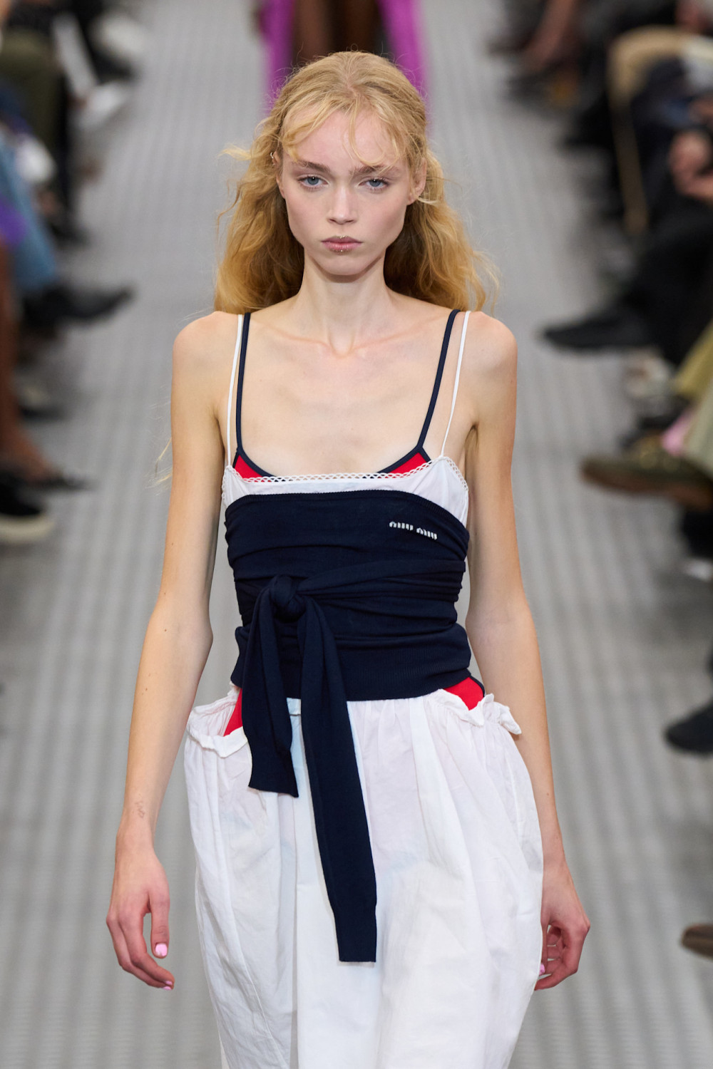 Далее модели шествовали по подиуму под техно-ритмы, миксованные с мультяшными звуками, в эклектичных нарядах, которые сочетали в себе разные эпохи и стили. Были представлены и платья в стиле 1920-х годов, обнажающие спортивные бра и спины, и хлопковые юбки в эдвардианском стиле, покрытые блестками в стиле ар-деко. Эти образы сочетались с двухцветными ветровками, которые отсылали к 80-х, вязаными гетрами, акцентными ремнями и фантазийной обувью — сочетания, характерные лишь для мира Миуччи Прады, для которой нет правил.