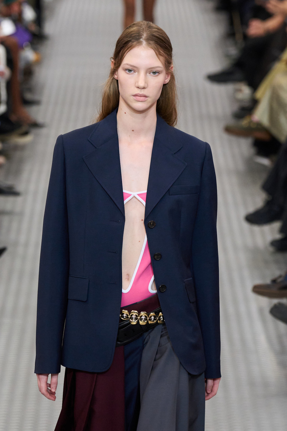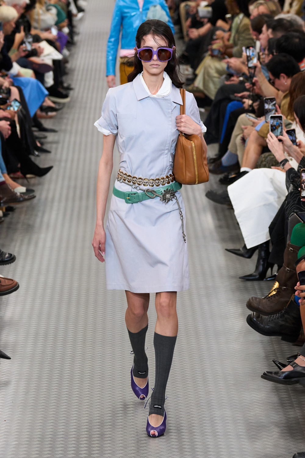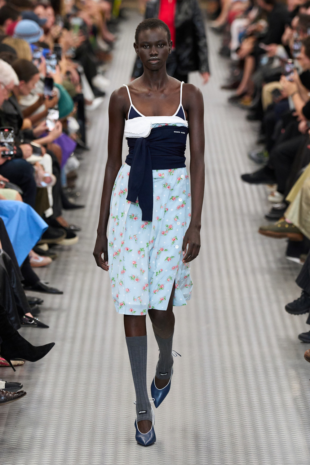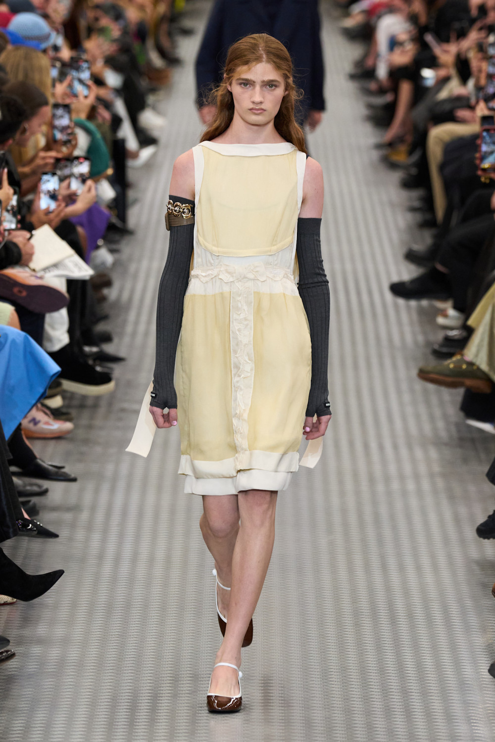 Далее модели шествовали по подиуму под техно-ритмы, миксованные с мультяшными звуками, в эклектичных нарядах, которые сочетали в себе разные эпохи и стили. Были представлены и платья в стиле 1920-х годов, обнажающие спортивные бра и спины, и хлопковые юбки в эдвардианском стиле, покрытые блестками в стиле ар-деко. Эти образы сочетались с двухцветными ветровками, которые отсылали к 80-х, вязаными гетрами, акцентными ремнями и фантазийной обувью — сочетания, характерные лишь для мира Миуччи Прады, для которой нет правил.