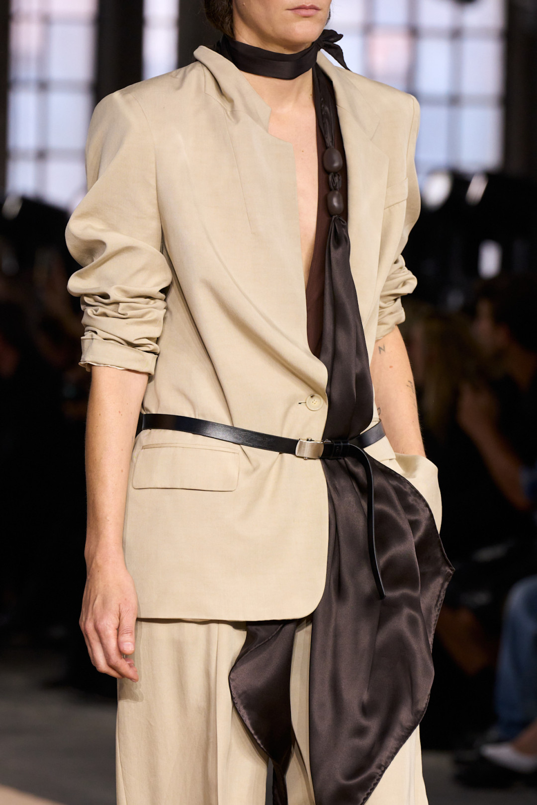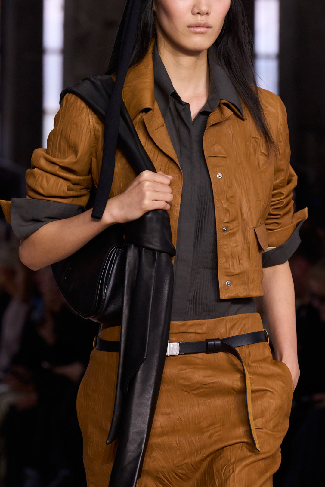 Функциональные карманы, глубокие вырезы на спине у мешковатого платья из 50-60-х, в котором дефилировала Амелия Грей, мягкие джерси-топы по косой, надетые на строгие брюки, — дихотомия строгости и непринужденности проявлялась в деталях. Этот контраст ощущался даже на уровне фактур: матовый хлопок соседствовал с шелком, мягкая кожа — с легкими драпировками. Вместе они создавали цельный образ, в котором строгость превращалась в свободу.