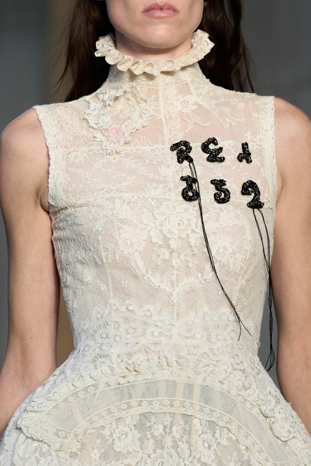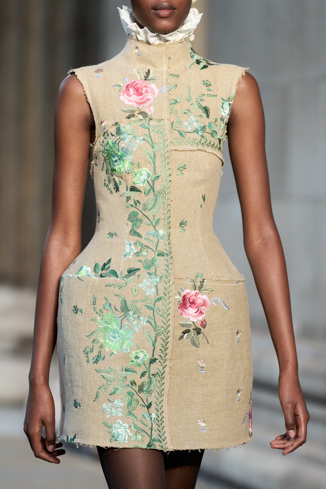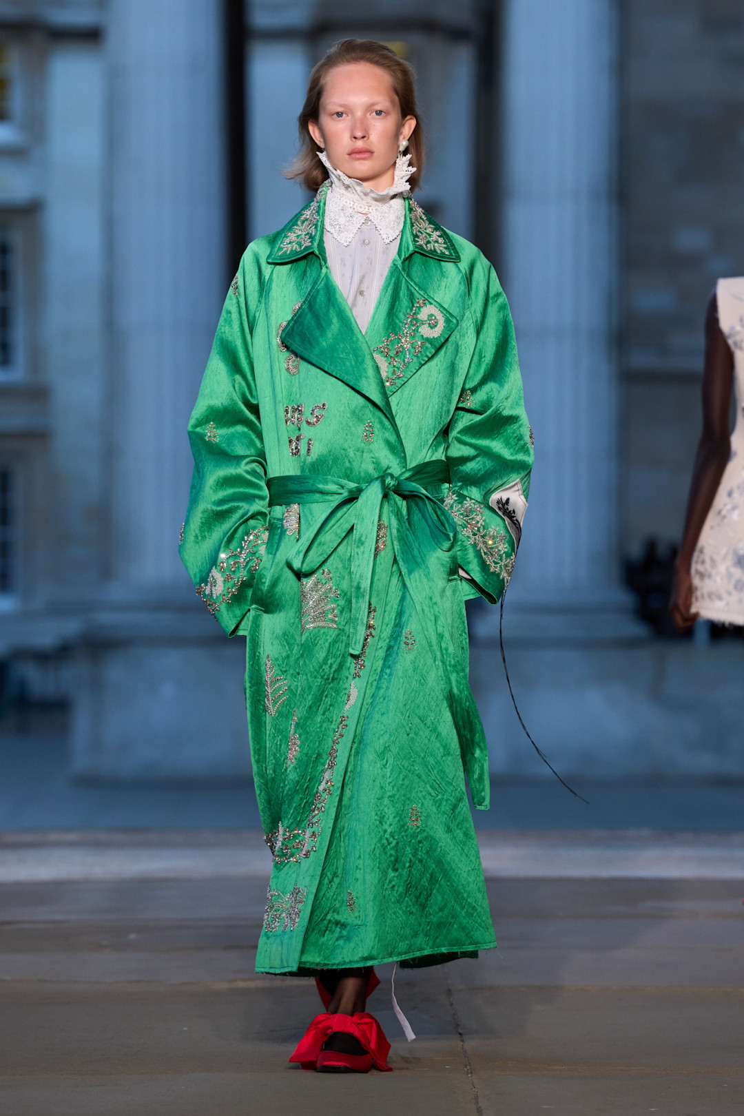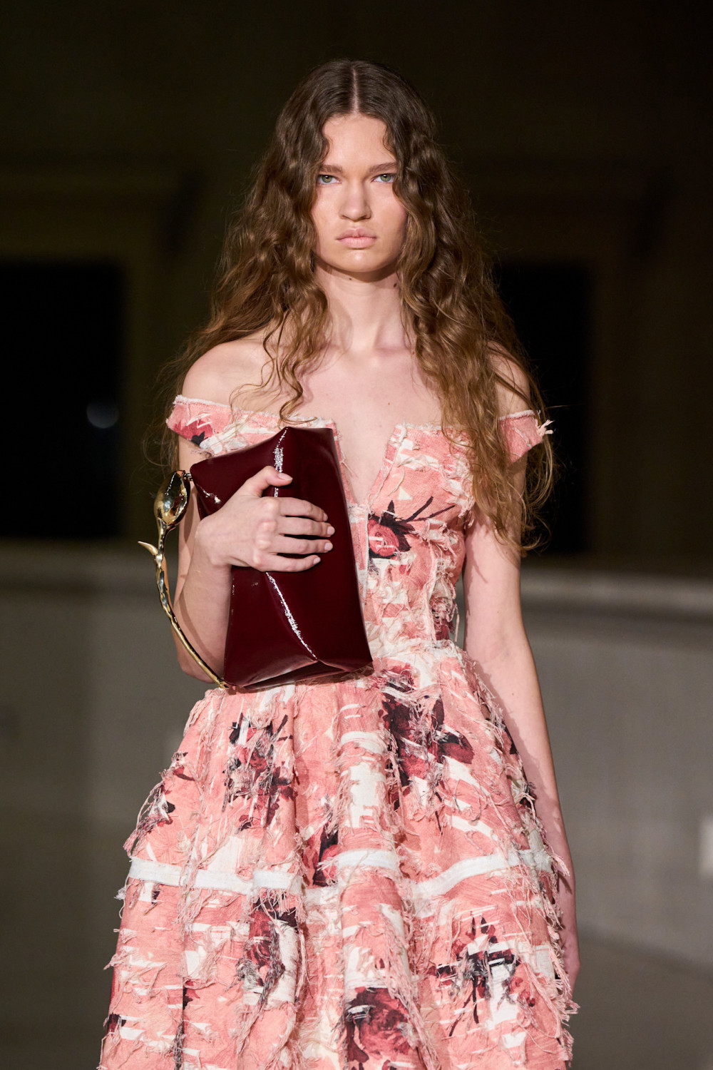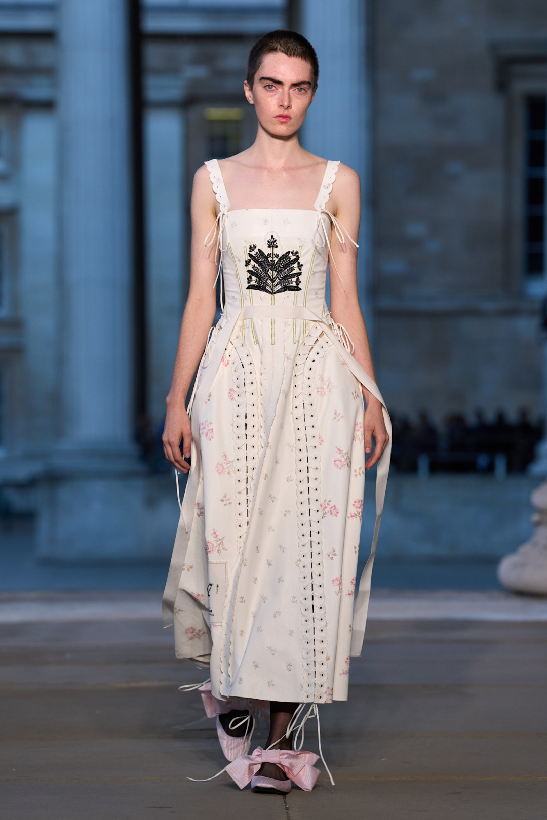 Моралиоглу отправился вслед за ее видениями и создал коллекцию, где Смит проживает свои многочисленные жизни: придворной дамы в Версале времен Марии-Антуанетты, индийской принцессы и даже туристки на Марсе. В более чем 40 выходах переплелись ажур, кристаллы и оттенки, напоминающие марсианские пейзажи. Одни модели выходили на подиум в корсетных мини-платьях из винтажного кружева, другие — в шелковых пальто-халатах, расшитых цветами.