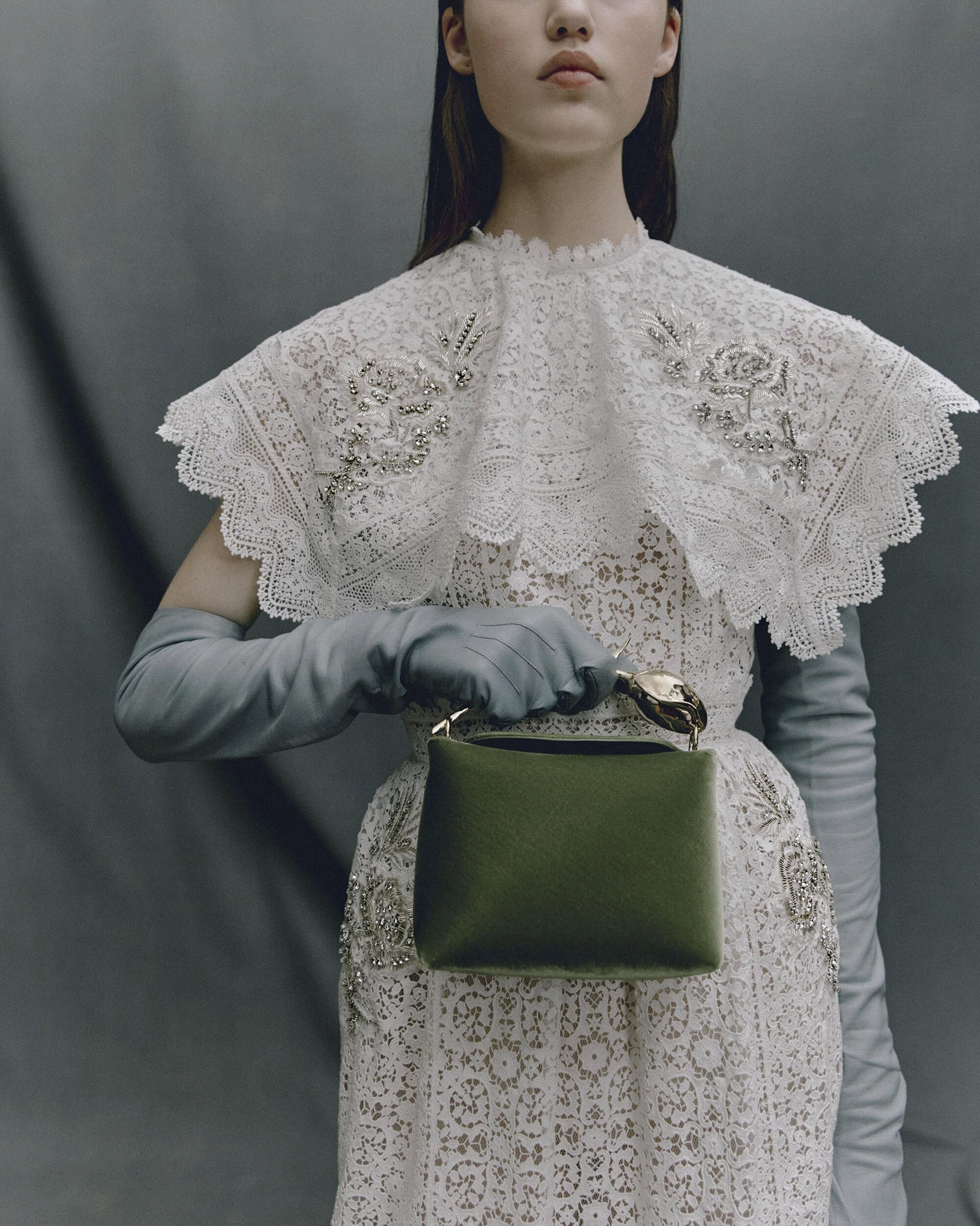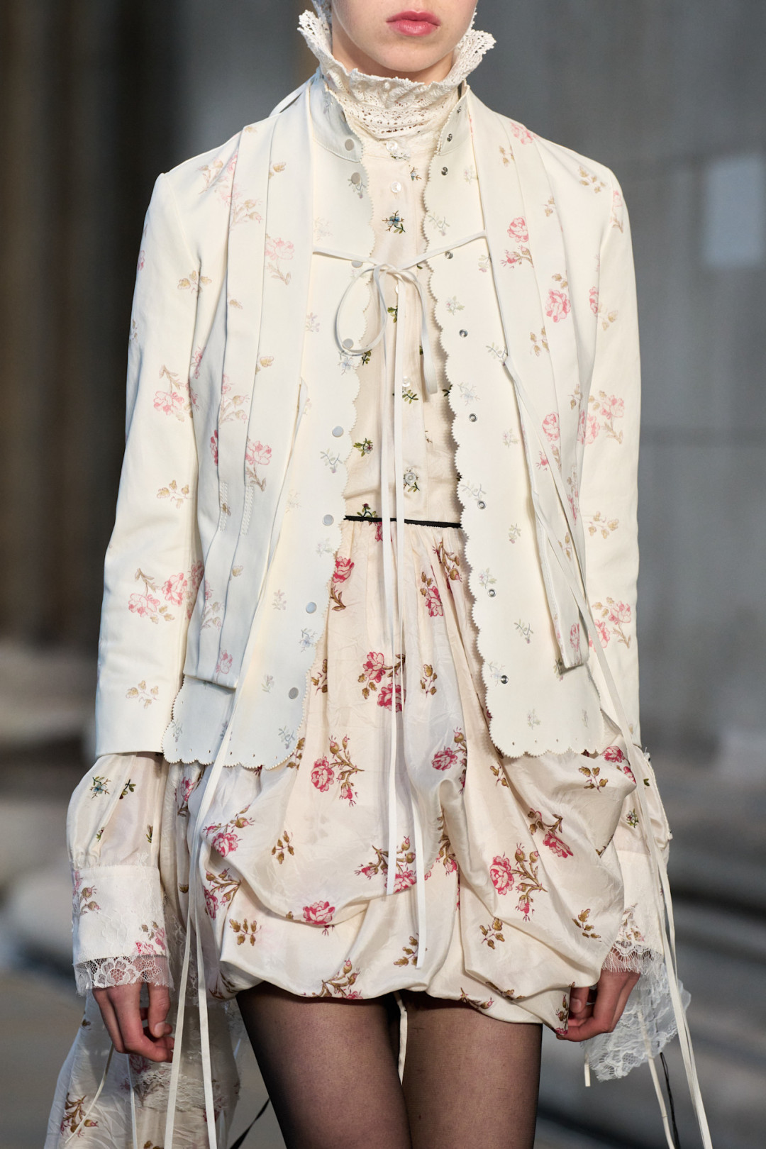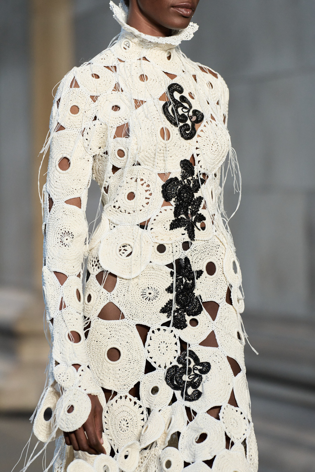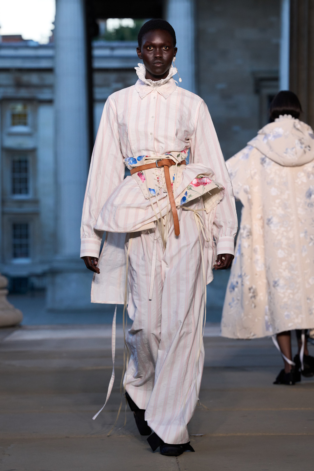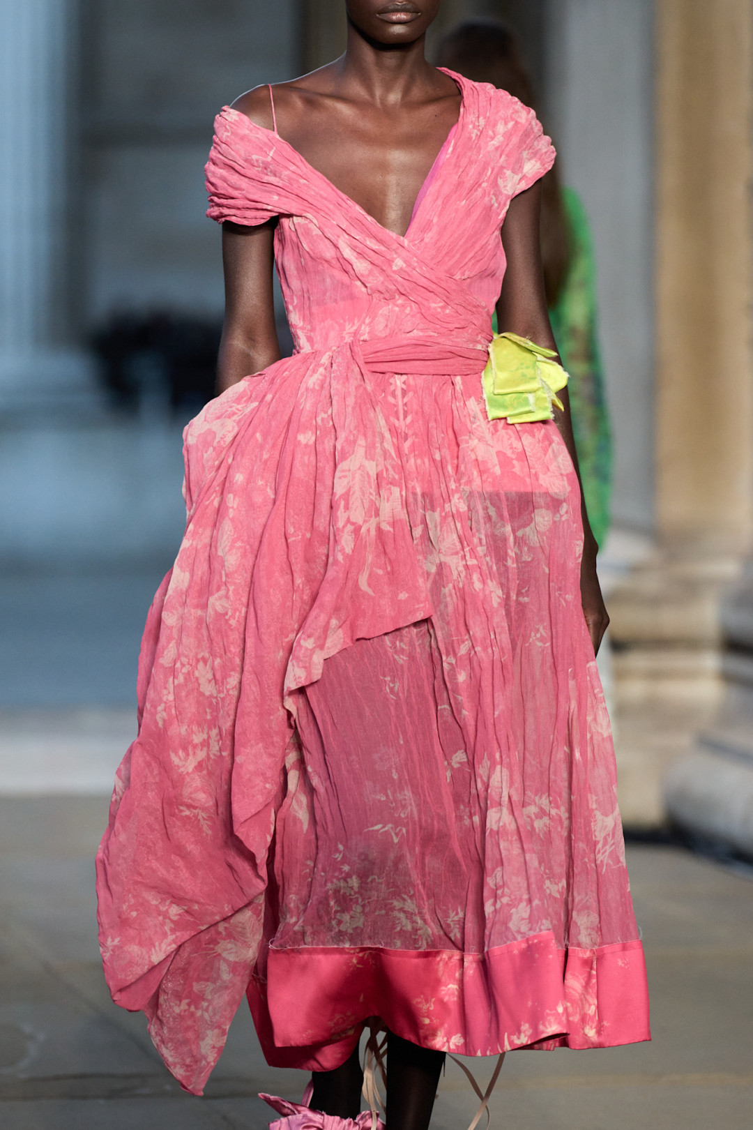 Моралиоглу отправился вслед за ее видениями и создал коллекцию, где Смит проживает свои многочисленные жизни: придворной дамы в Версале времен Марии-Антуанетты, индийской принцессы и даже туристки на Марсе. В более чем 40 выходах переплелись ажур, кристаллы и оттенки, напоминающие марсианские пейзажи. Одни модели выходили на подиум в корсетных мини-платьях из винтажного кружева, другие — в шелковых пальто-халатах, расшитых цветами.