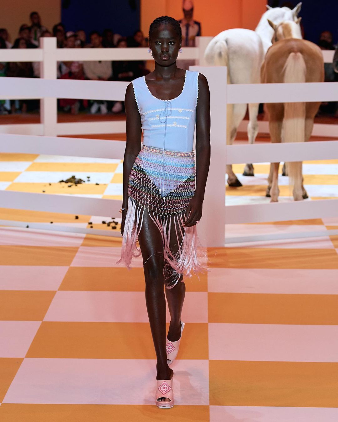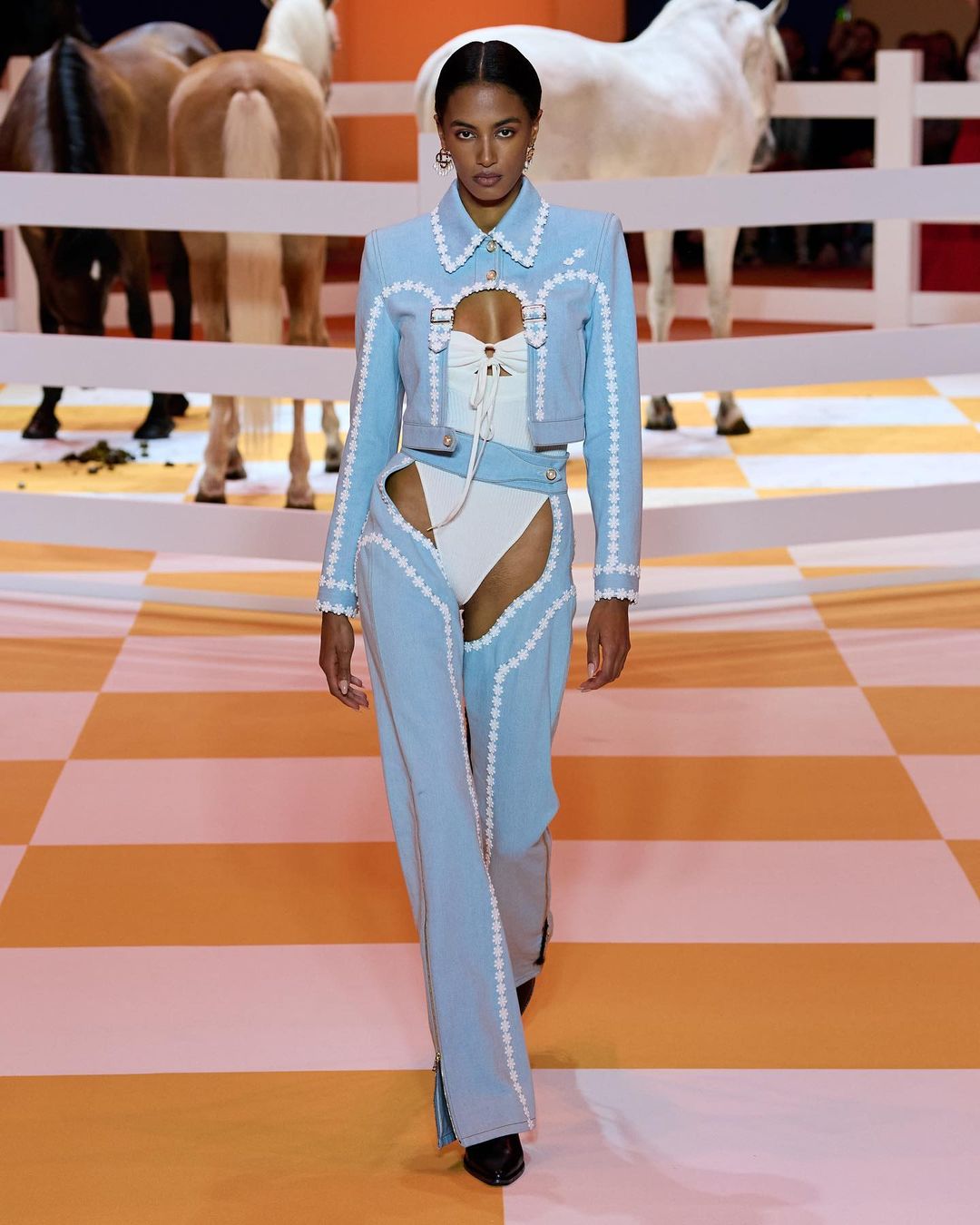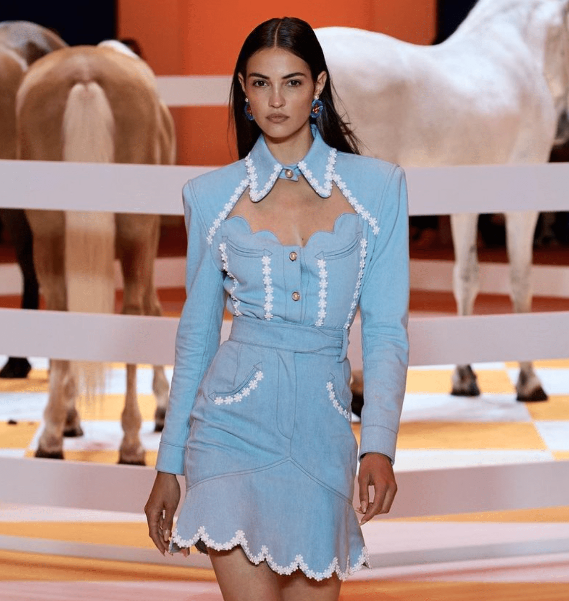 Основу коллекции бренда составили обтягивающие комбинезоны, поверх которого дизайнер предлагает надевать платья, боди и сочетать их с крупными украшениями. В шоу также участвовали певицы Sevdaliza, Джорджа Смит и Лурдес Леон, которая закрыла показ французского модного Дома.