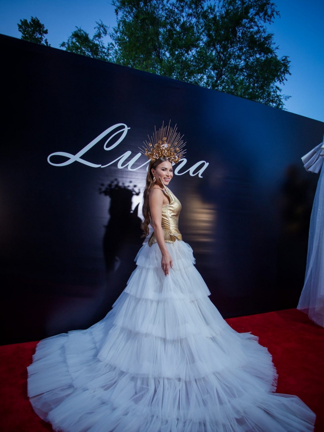 Начнем с наряда виновницы торжества Луины. Звезда сразу дала понять, что казахским балом Института костюма правит она, воплотив образ египетской царицы от Arunaz. И про корону не забыла.