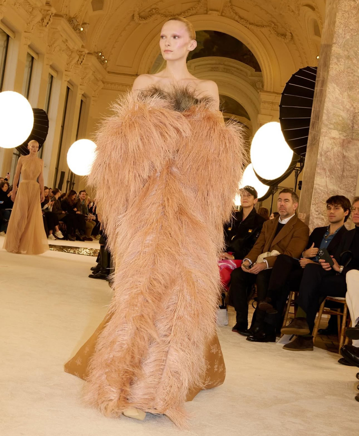Стоит отметить, что интерес к прошлому также проявился и в неожиданных деталях. Все началось с коробки старинных лионских материй начала XX века, найденной Роузберри. Эти ленты, забытые временем, превратились в настоящие шедевры. Одна модель предстала на подиуме в платье из коричневого муара, а другая — в образе , выполненном из вертикальных рядов шелка, которые словно оживали с каждым шагом.