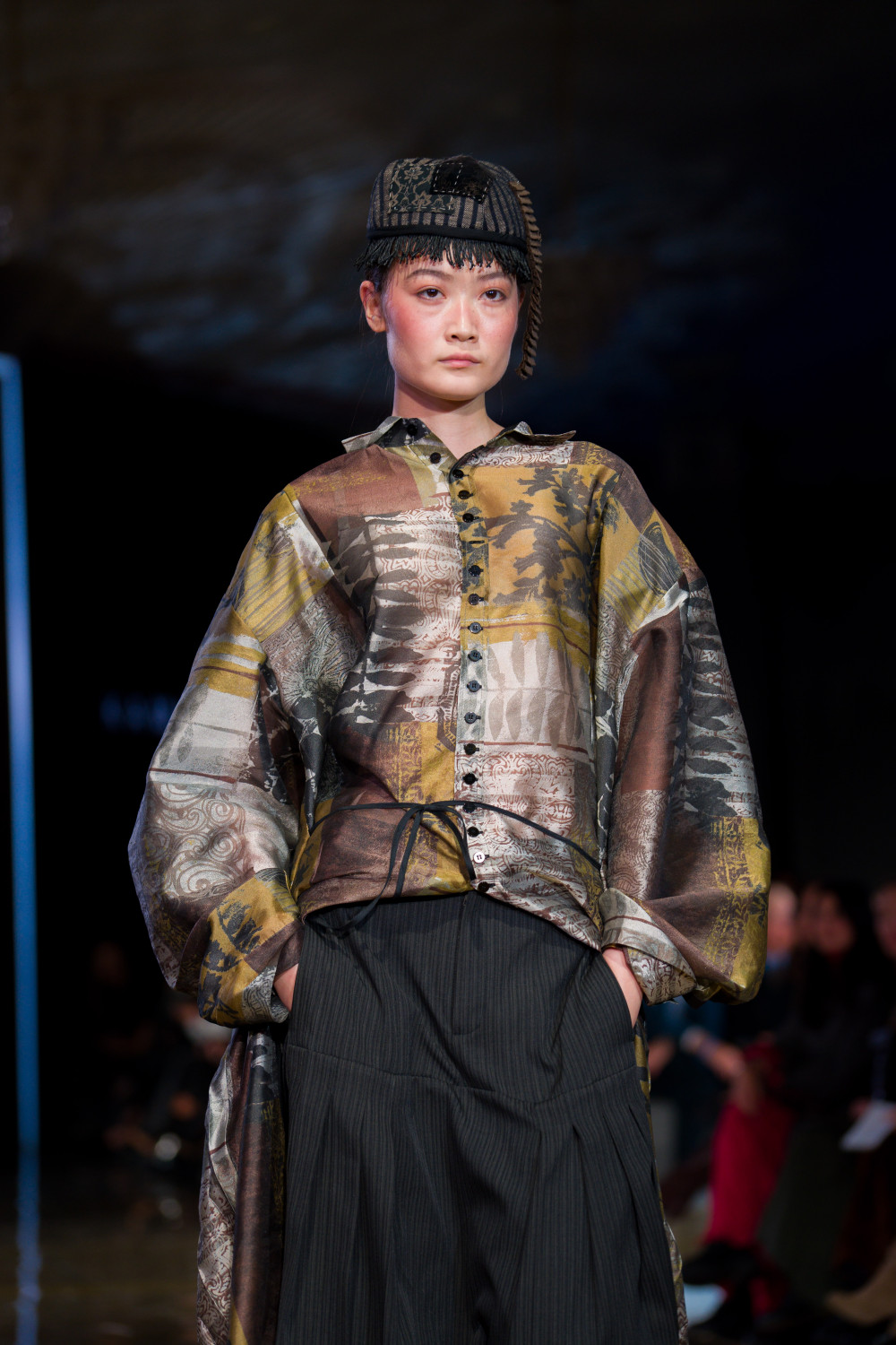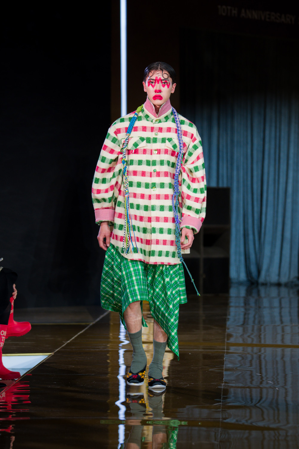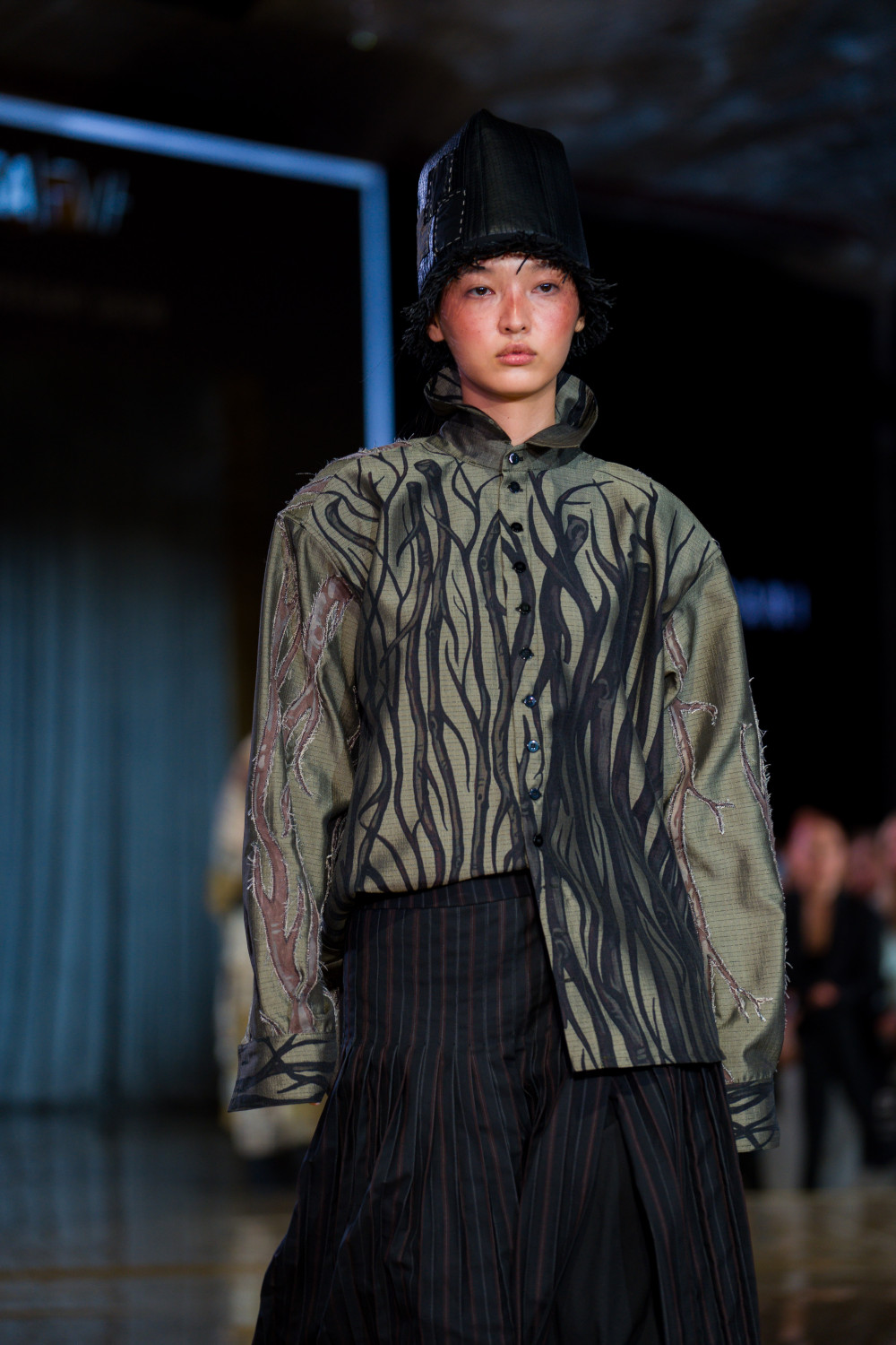 На показе были представлены изделия для тех, кто хочет выйти за рамки трендов, желая привлекать взгляды своей оригинальностью. Одни модели демонстрировали жакеты с таинственными прорезями и юбки-брюки, а другие — рубашки, на которых расположились изображения сухих веток. Отдельного внимания заслуживает асимметричный пиджак, одна сторона которого выполнена в классическом стиле, а другая достигает щиколотки, и аксессуары. Дополнением образов послужили маски с бахромой, шляпы-ведра и фантазийные сумки в форме овощей.