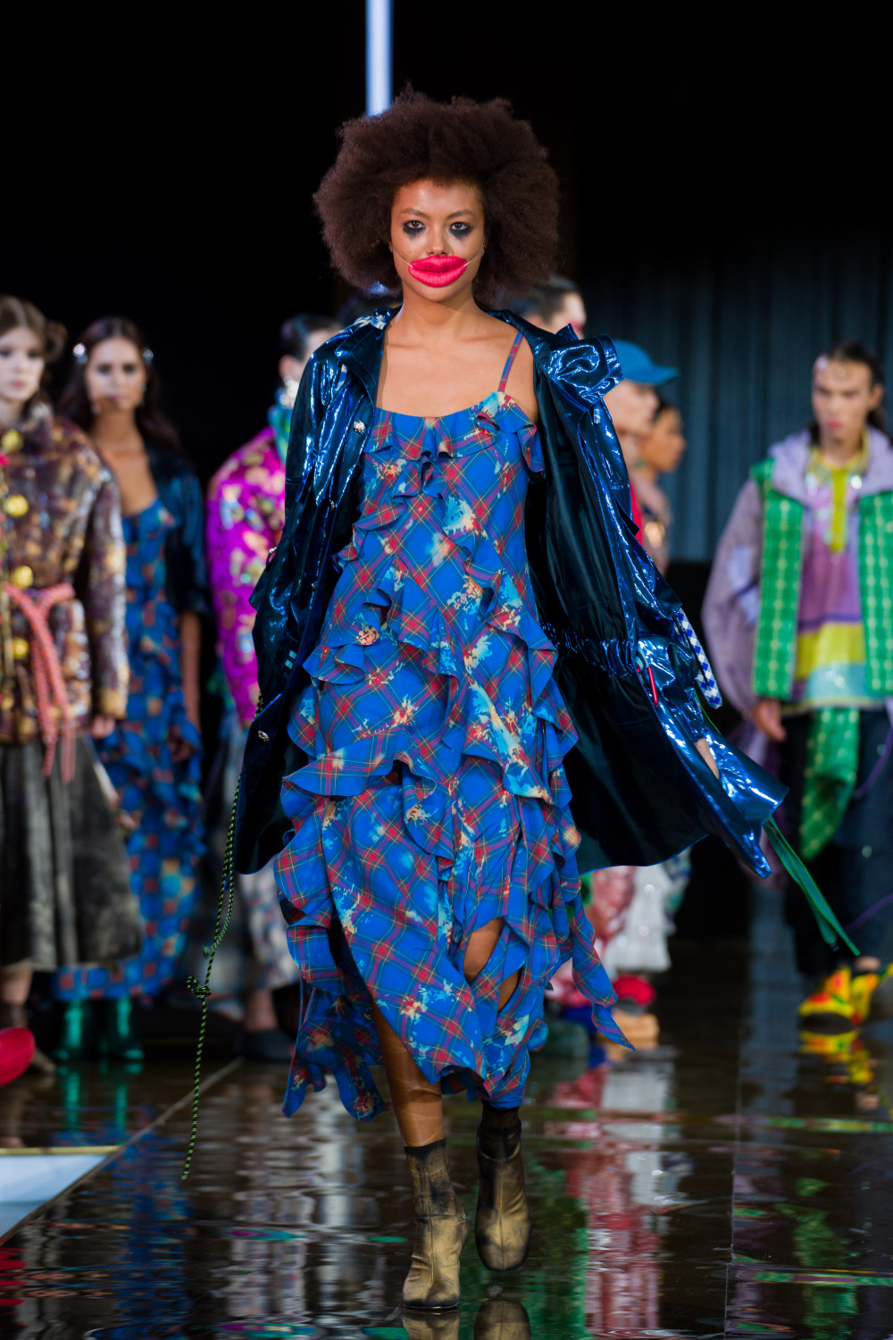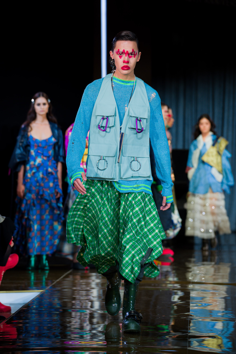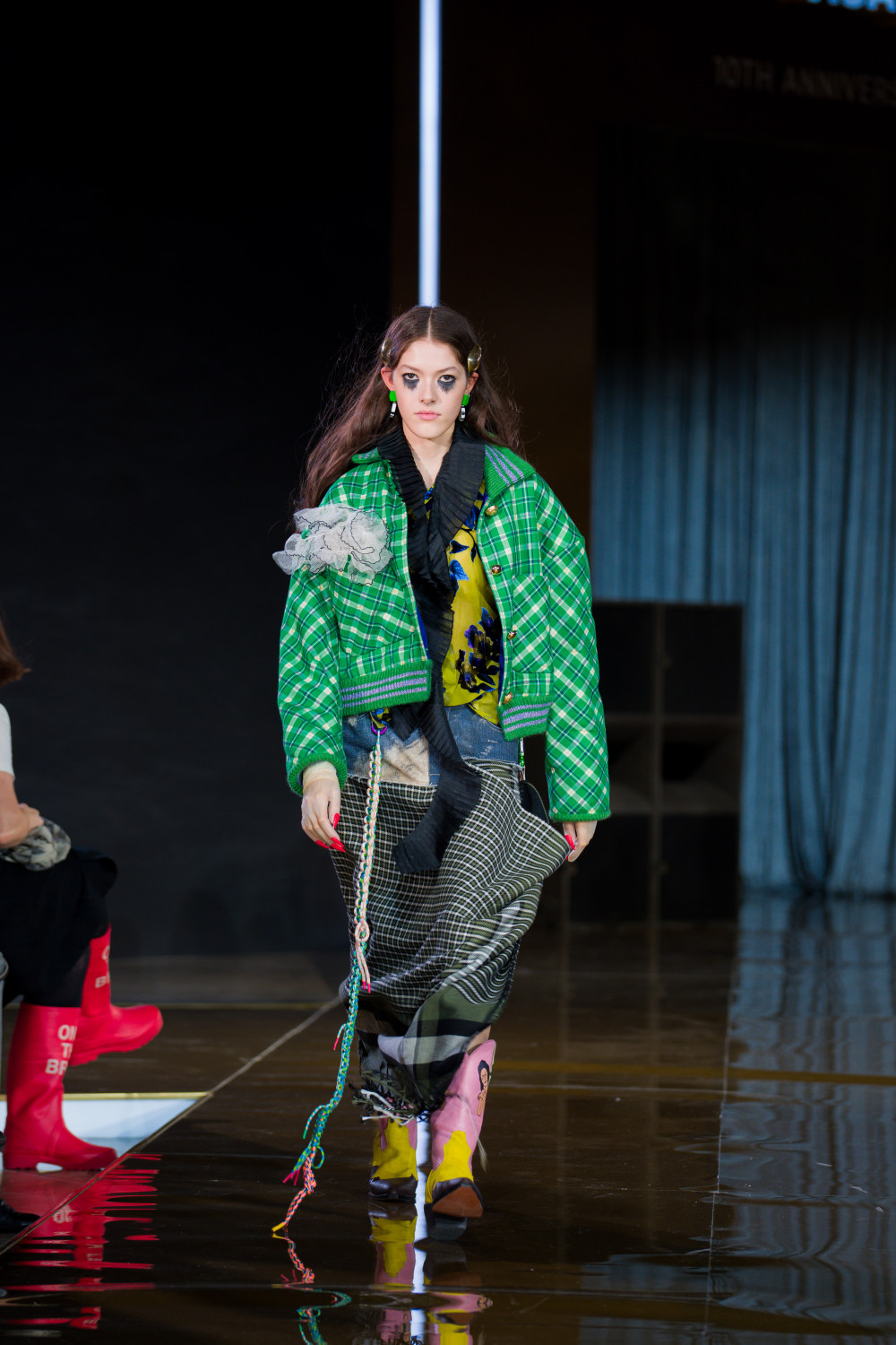 На показе были представлены изделия для тех, кто хочет выйти за рамки трендов, желая привлекать взгляды своей оригинальностью. Одни модели демонстрировали жакеты с таинственными прорезями и юбки-брюки, а другие — рубашки, на которых расположились изображения сухих веток. Отдельного внимания заслуживает асимметричный пиджак, одна сторона которого выполнена в классическом стиле, а другая достигает щиколотки, и аксессуары. Дополнением образов послужили маски с бахромой, шляпы-ведра и фантазийные сумки в форме овощей.