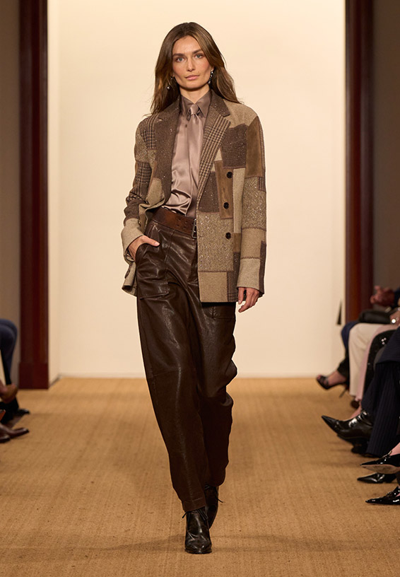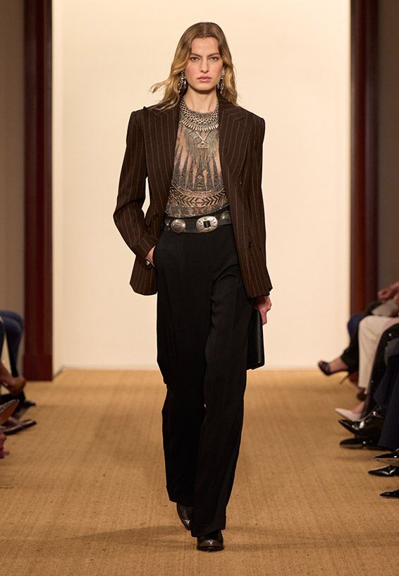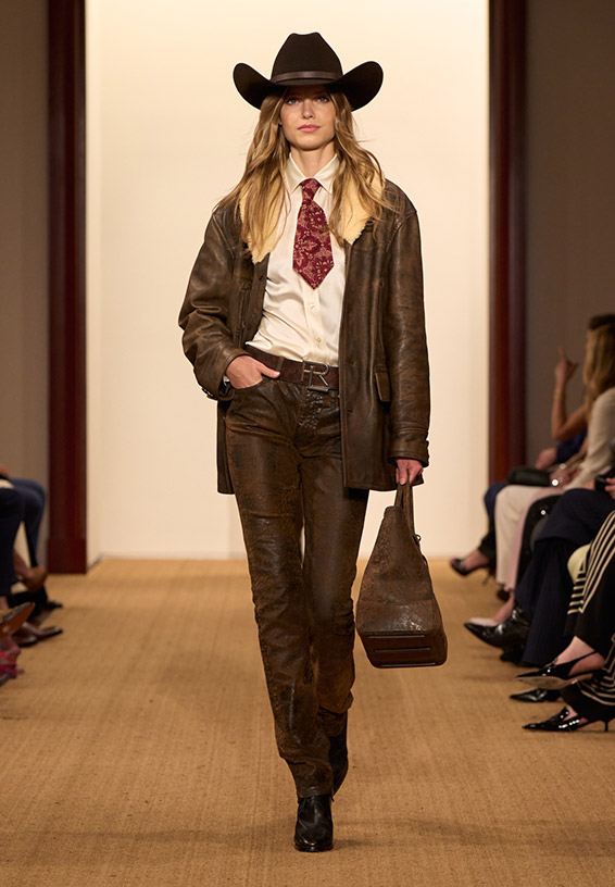 Показ открыла супермодель Кристи Терлингтон в однобортном кашемировом пальто цвета слоновой кости с галстуком, заправленным в брюки, и кожаной сумкой RL 888 — это стало свидетельством способности Лорена усовершенствовать и доводить до совершенства классические предметы гардероба. Дополнением ее образа послужили ковбойские сапоги. Затем последовала серия моделей в успокаивающих нейтральных тонах: оттенках коричневого, серого, черного и металлика. Юбки из шелкового атласа и расшитые бисером платья, кардиганы в стиле племени навахо и кожаные брюки, юбки-карандаши и брючные костюмы в полоску — все это было гармонично собрано воедино. На первый взгляд без особых усилий.