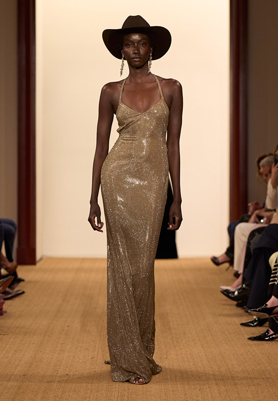 Не обошлось и без привычных для бренда вестерн-акцентов, которые в последние несколько сезонов были замечены на подиумах именитых брендов. Длинная бахрома расположилась на пальто и рукавах пиджаков, а ковбойские шляпы сопровождали не только повседневные наряды, но и, к примеру, сверкающее платье без спины.