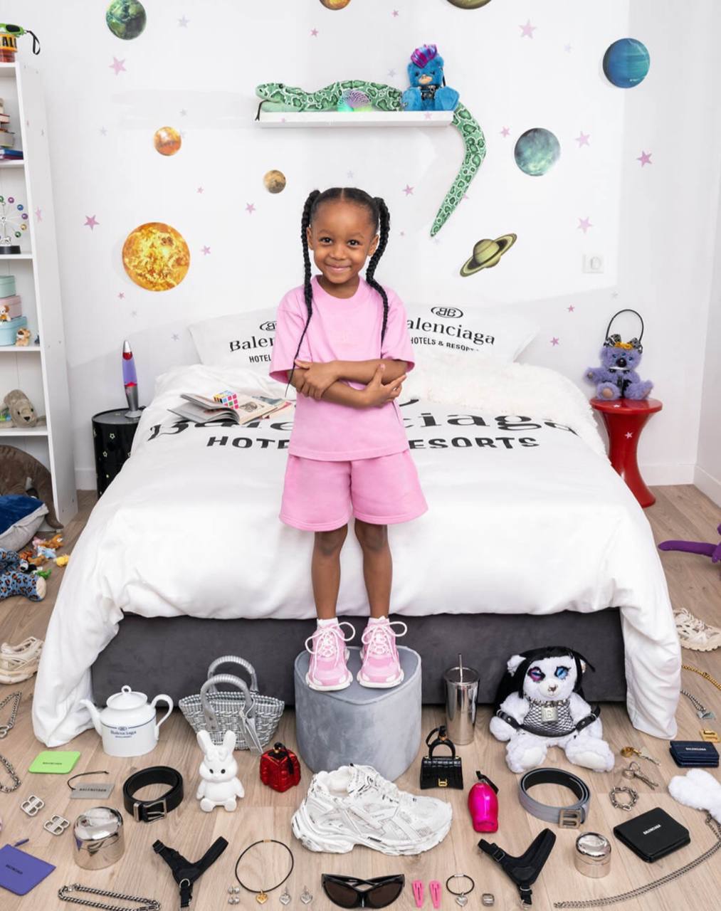 Ланчбоксы, стаканчики для кофе, чайный сервиз, постельное белье, миски с шипами и даже кровать для вашего питомца в фирменном розовом цвете — поклонники Balenciaga ликуют. В линейке можно найти подарок для любого повода. Елочные игрушки в виде главных хитов бренда станут отличной опцией к Новому году, а золотая скульптура в виде кроссовка Triple S и набор подсвечников в виде банок для газировки — на новоселье.
