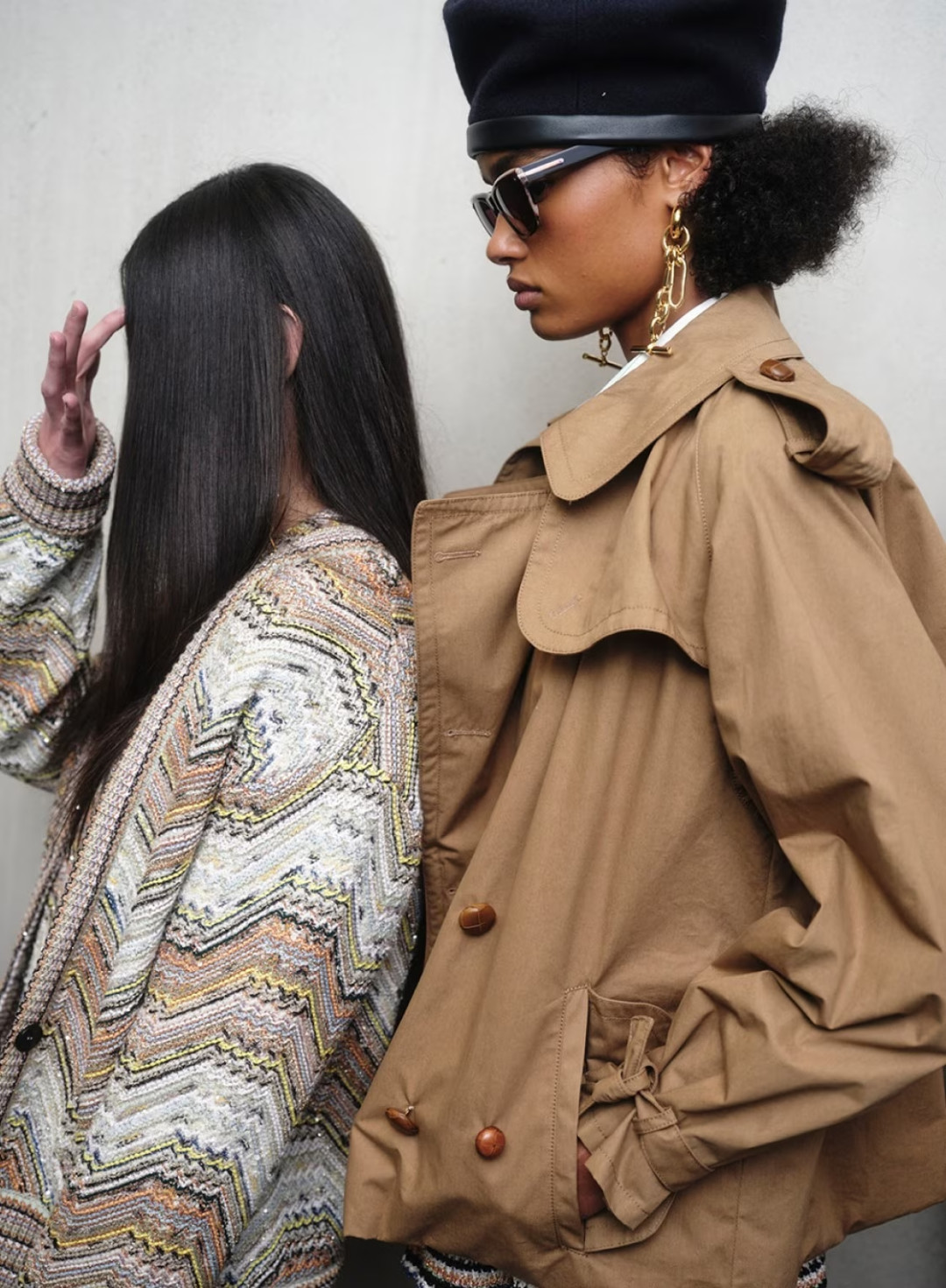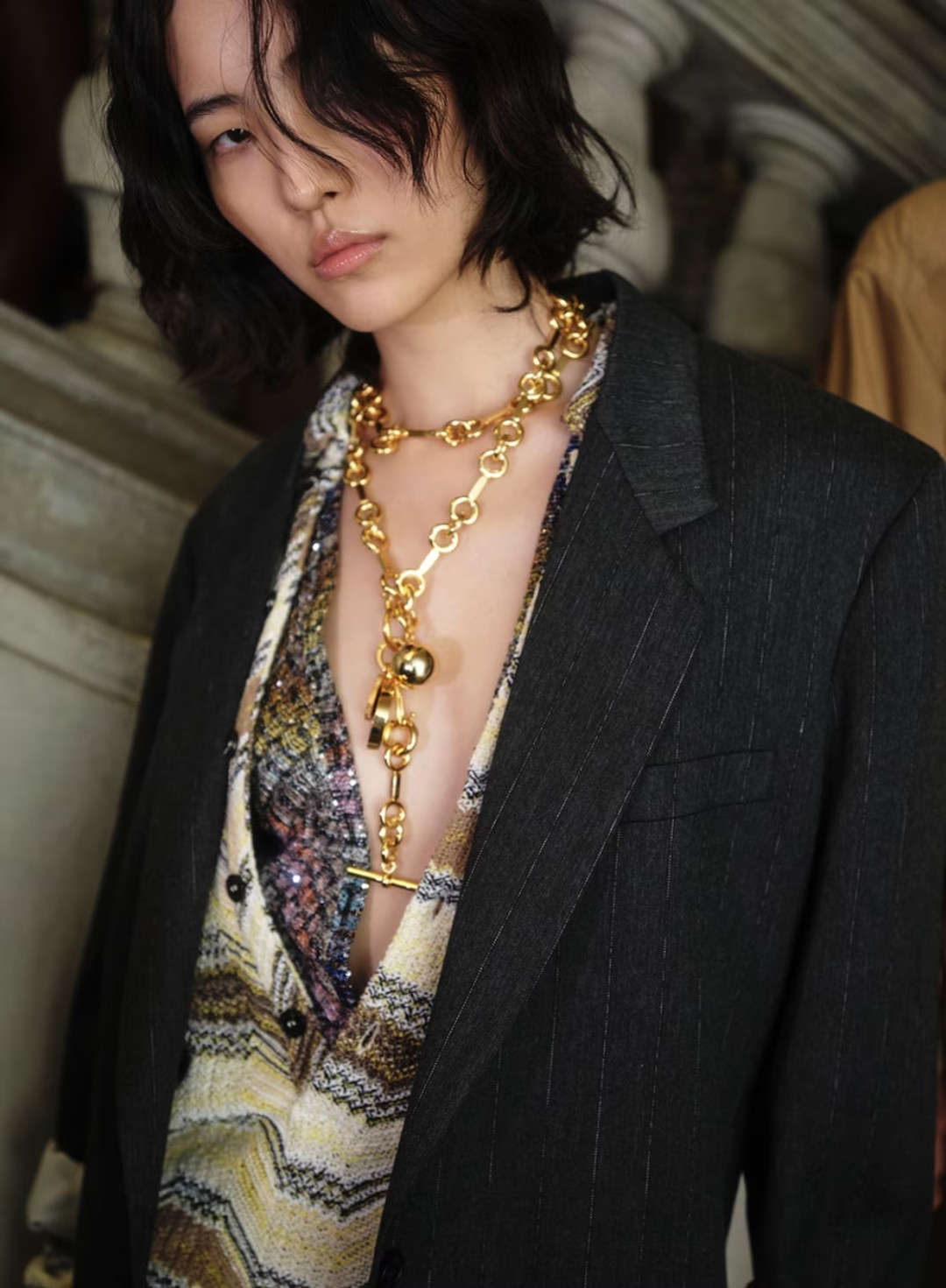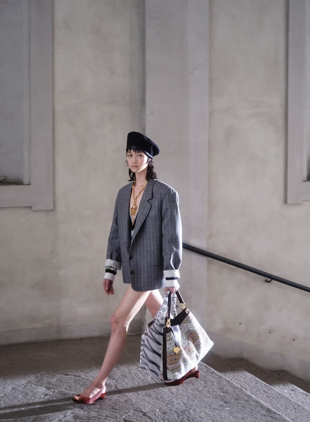 На каждом кресле гостей ожидало полотенце Missoni — символ коллекции и одновременно практичная деталь, которая пригодилась во время дождливой миланской Недели моды. Этот жест стал тонким намеком на настроение шоу — desk-to-deck-chair» — переход из повседневной жизни в состояние бесконечного лета.