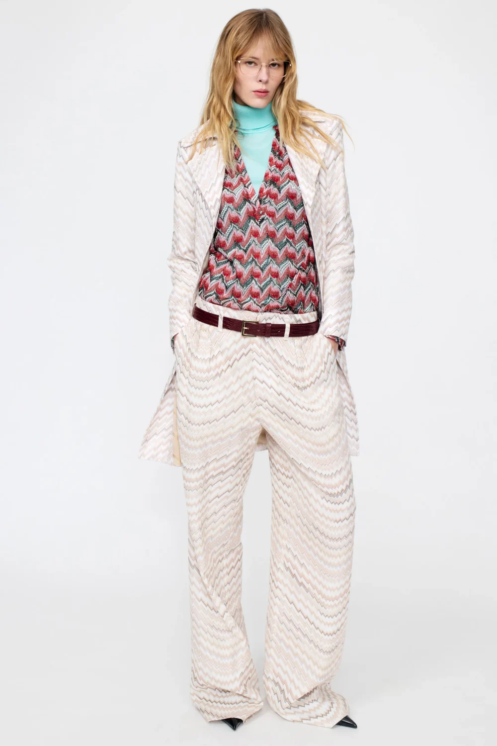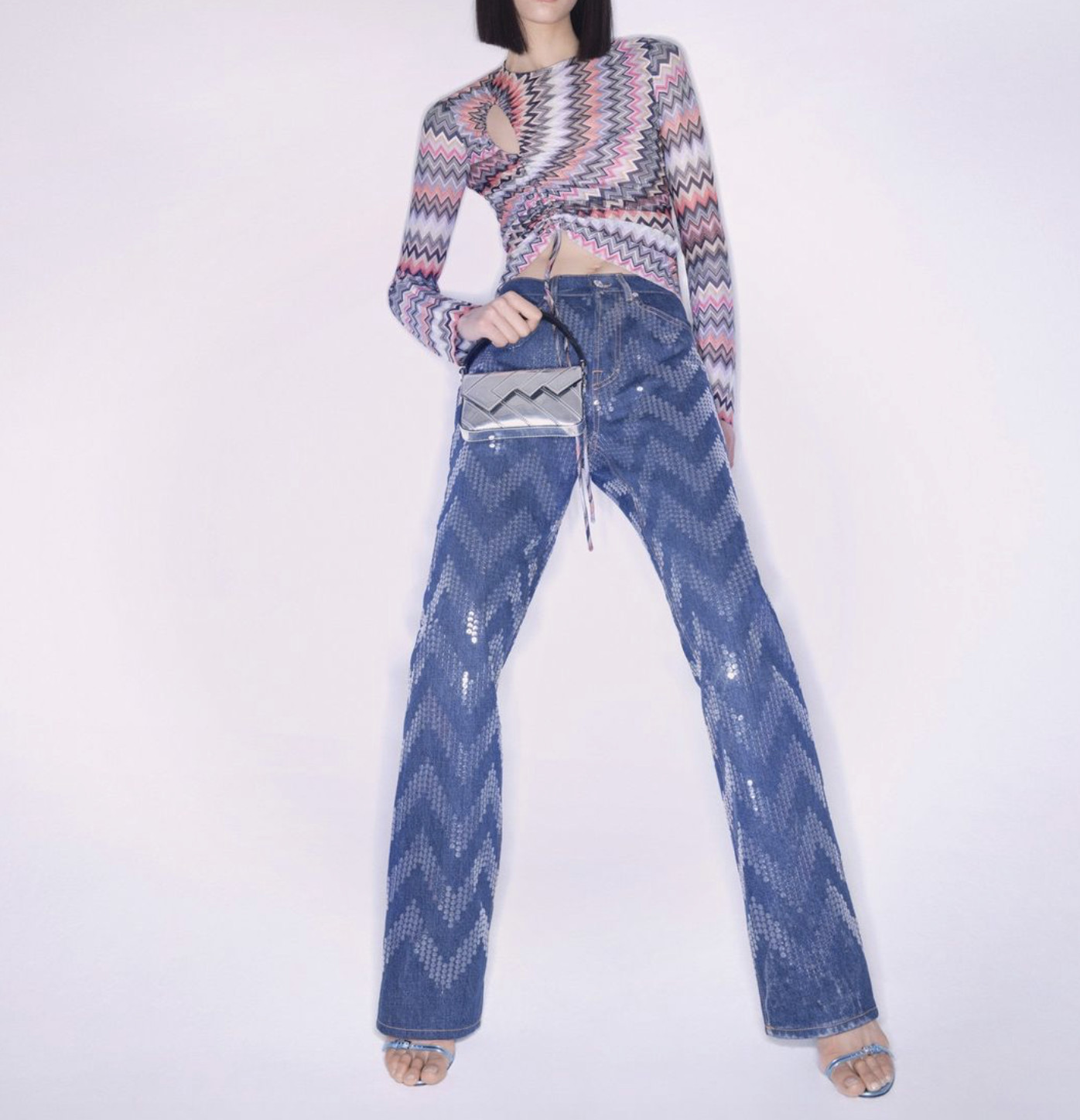 Героиня Missoni? В этом сезоне она делает ставку на короткие силуэты: бикини с глубокими вырезами, мини-юбки и шорты с подворотами. Дополняет она их свитерами, кардиганами и блестящими блузками, которые переливаются на свету. А на случай прохладных вечеров в ее арсенале есть короткие тренчкоты, приталенные пиджаки и милитари-жакеты — конечно, со знаковыми узорами марки.