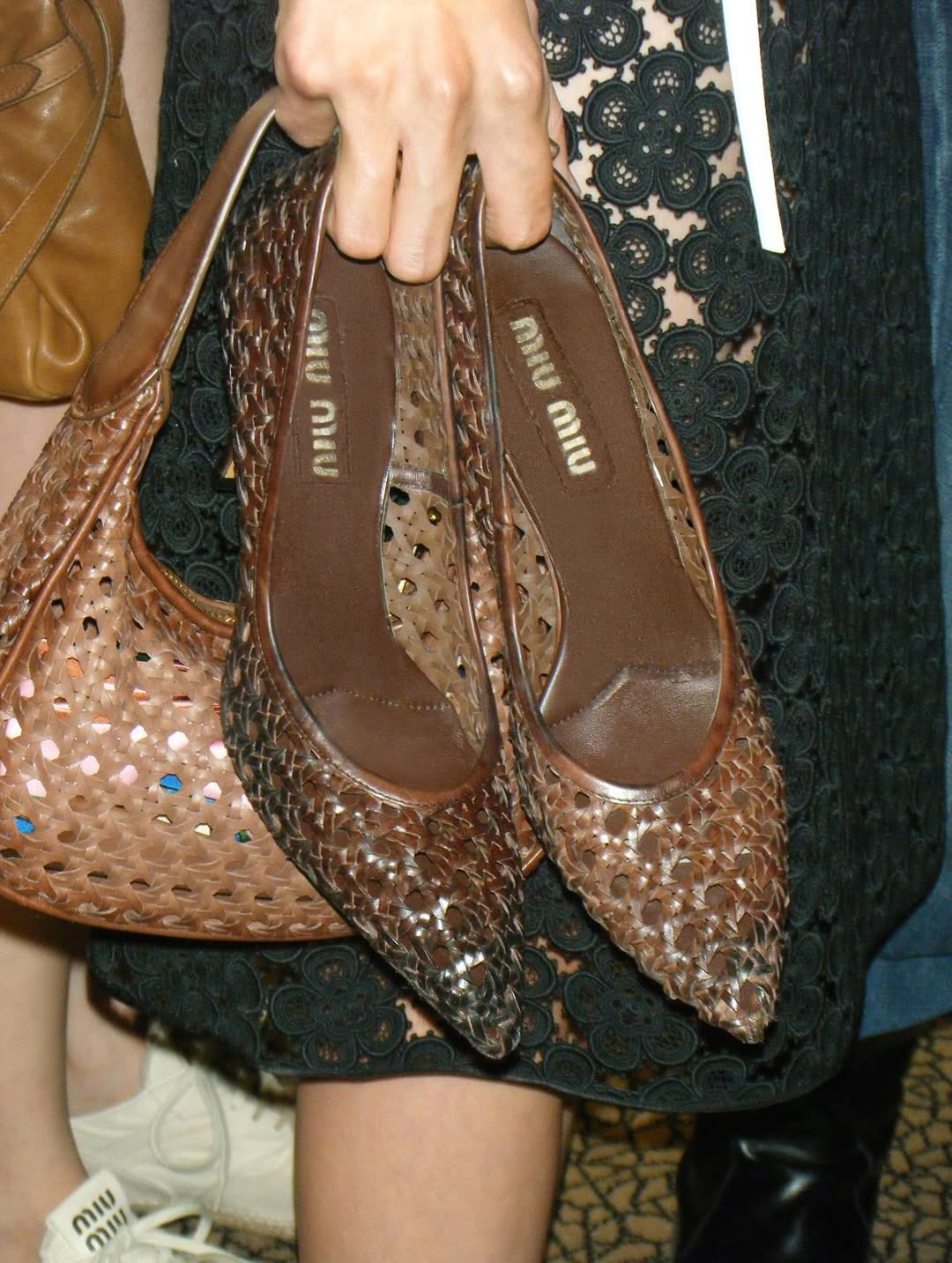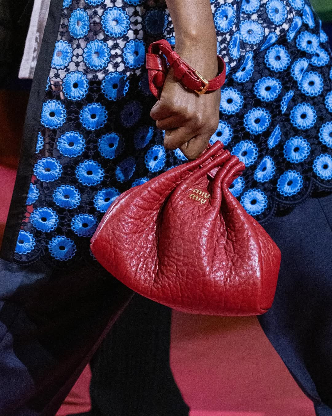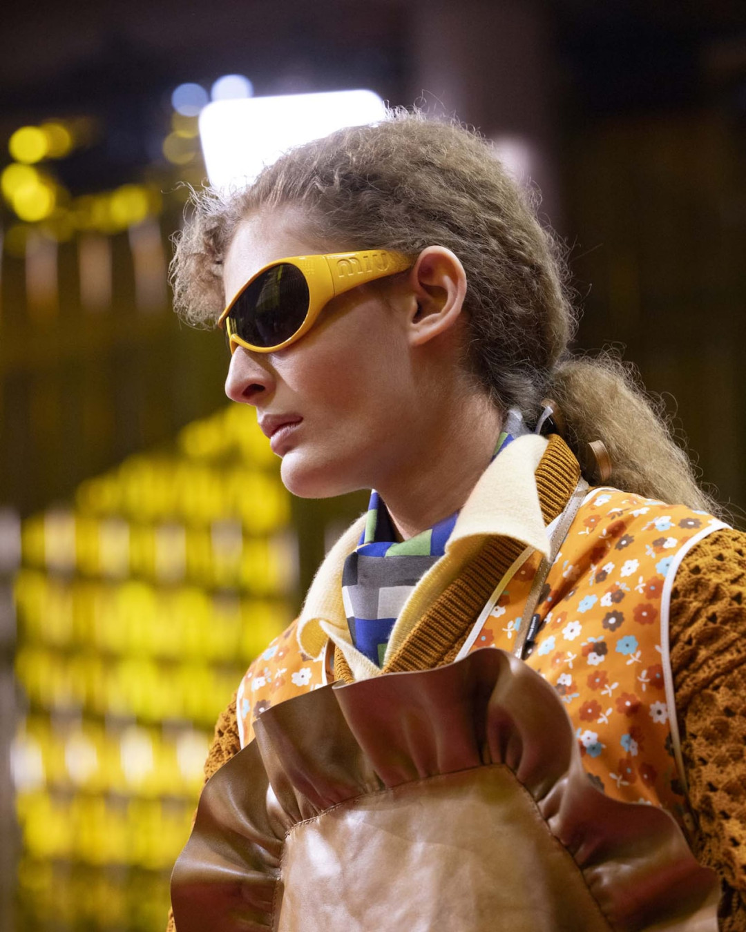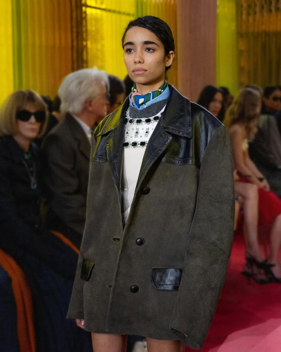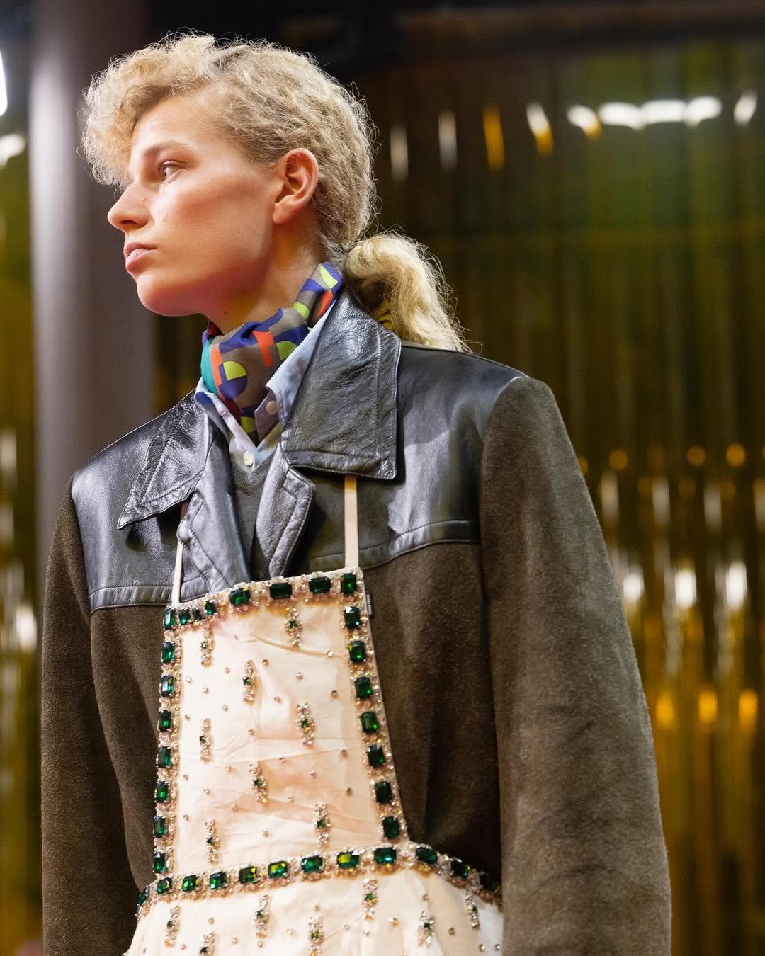 За стилизацию всего этого отвечала Лотта Волкова, тонко уловившая замысел Миуччи — показать женщину многослойной не только в метафорическом, но и в буквальном смысле. Шали, ремни, кожаные перчатки и даже белье на показ — все это превращало образы в манифест силы, уязвимости и практичности, переплетенных в том самом хаосе, который стал ДНК Miu Miu.