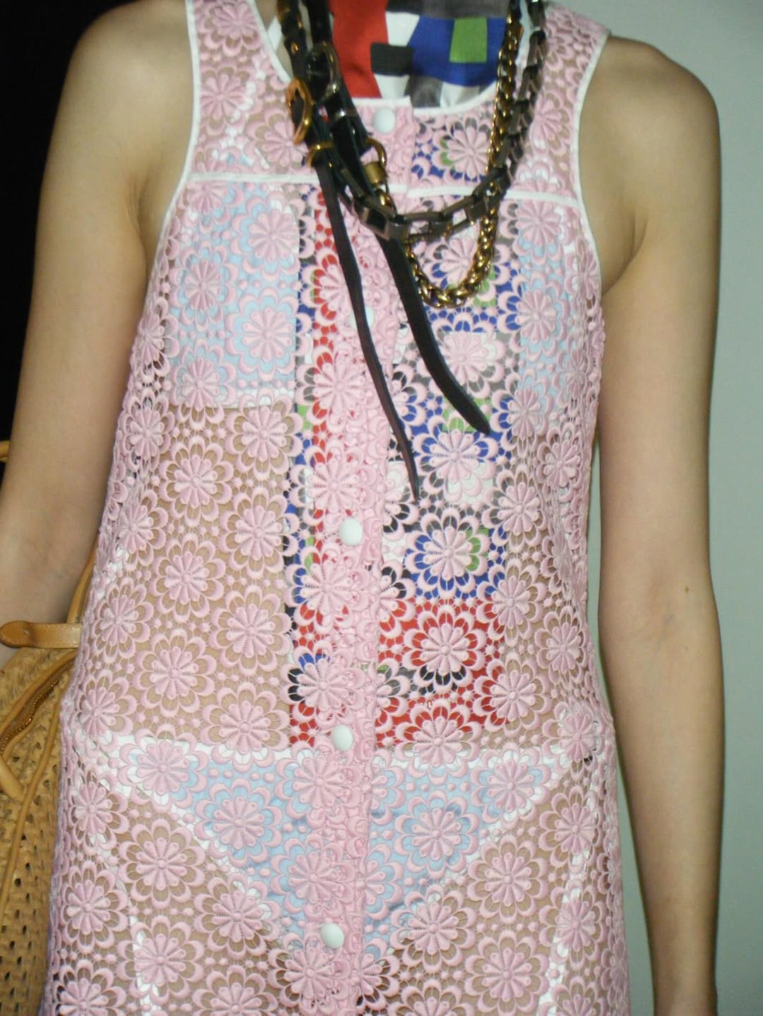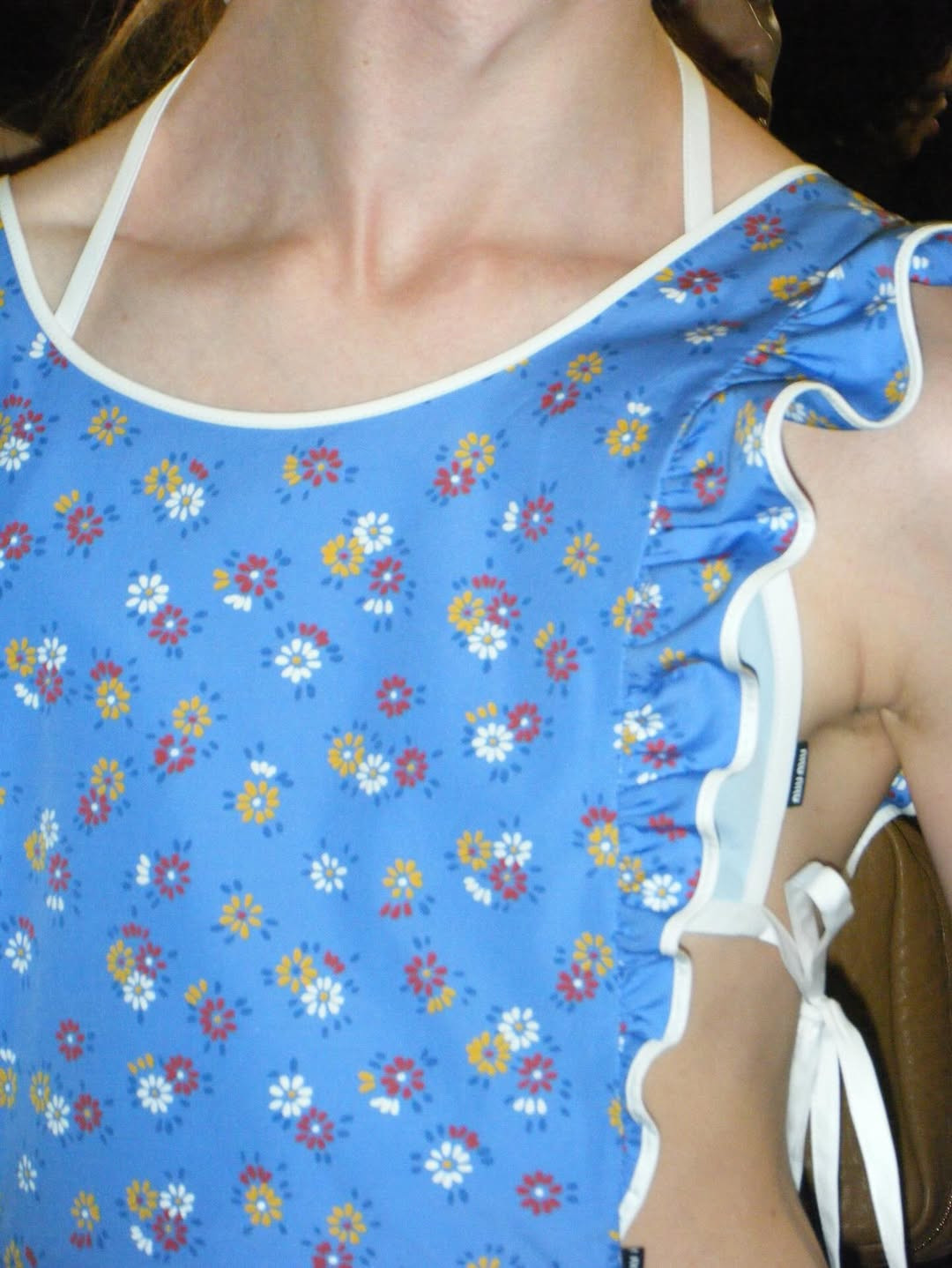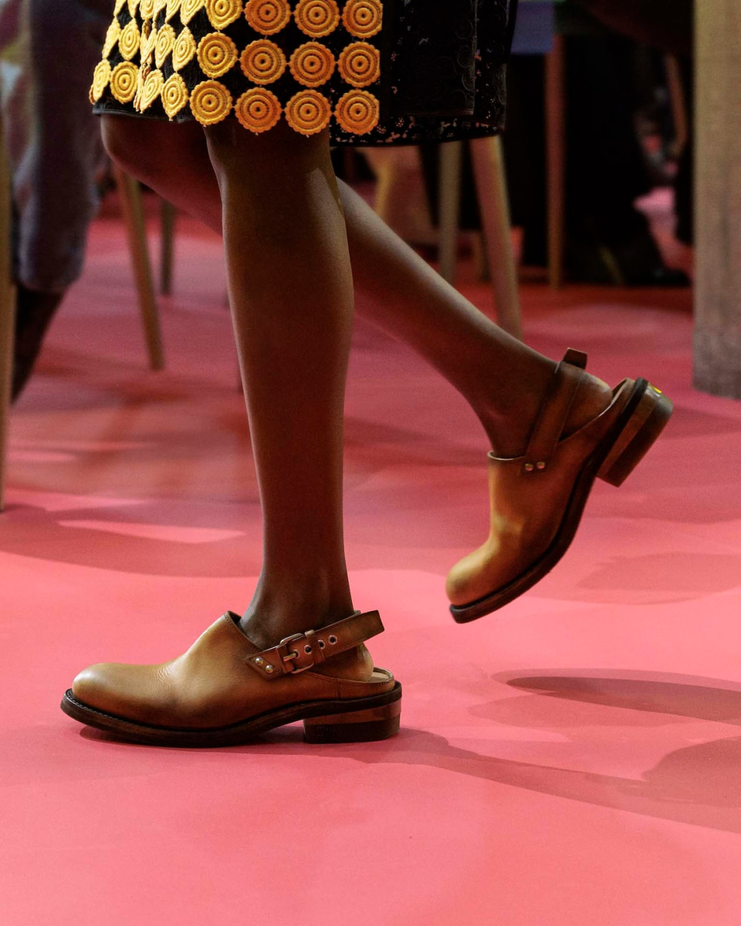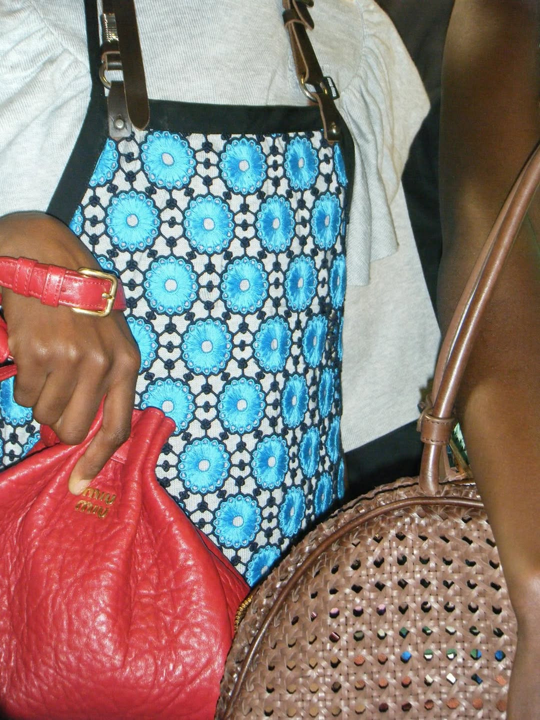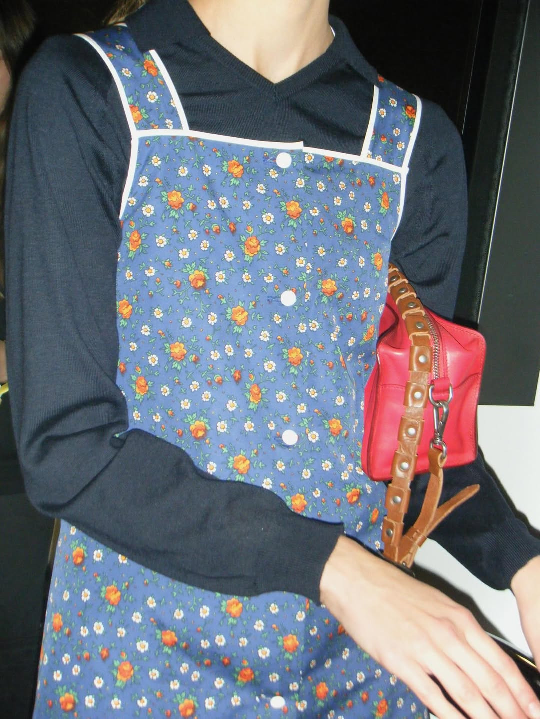 Коллекция SS ’26 включала 65 образов — и почти каждый сопровождался фартуком. Утилитарные модели с карманами сменялись кружевными, украшенными миниатюрными цветами, которые сочетались с прозрачными блузами и топами с бантами. В финале? Кожаные фартуки, надетые поверх бикини, как символ хрупкости и силы одновременно.