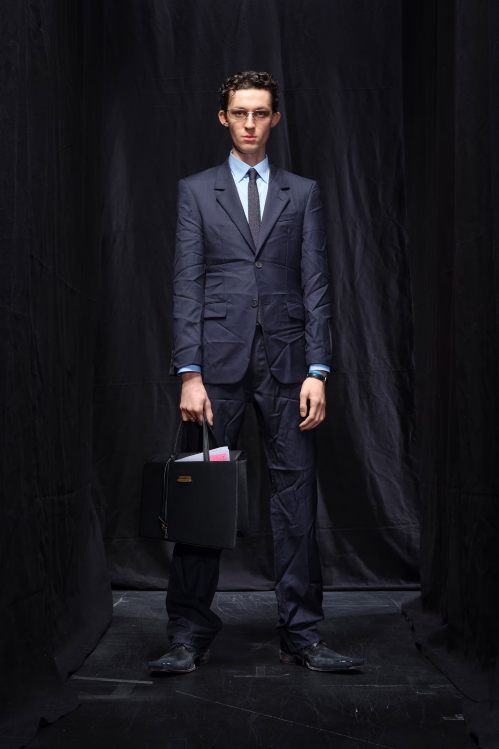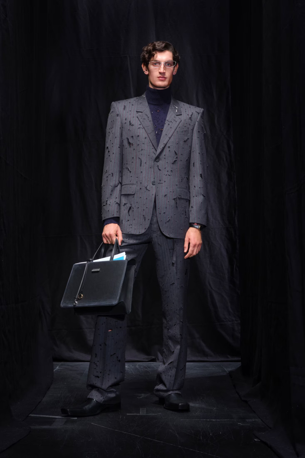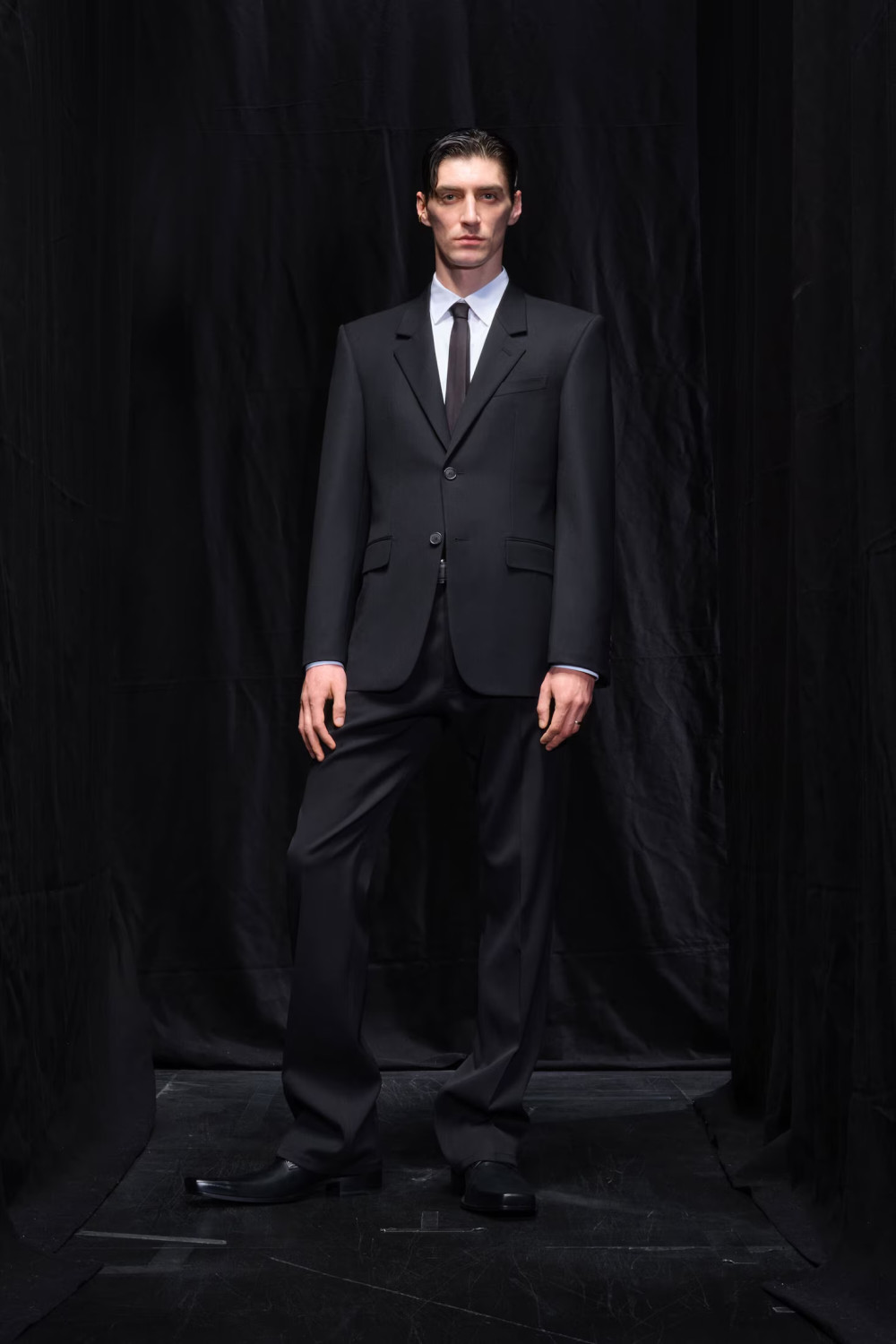Показ начался с появления мужчин в черных смокингах и галстуках — на первый взгляд, типичных охранников. Но их чуть помятые образы будто хранили следы ночных приключений или долгой дороги домой. «Может, я стал версией Демны 2.0. Может, я наконец дорос до костюма», — с улыбкой заметил дизайнер, напоминая, что даже в строгом смокинге всегда можно оставить место для иронии.