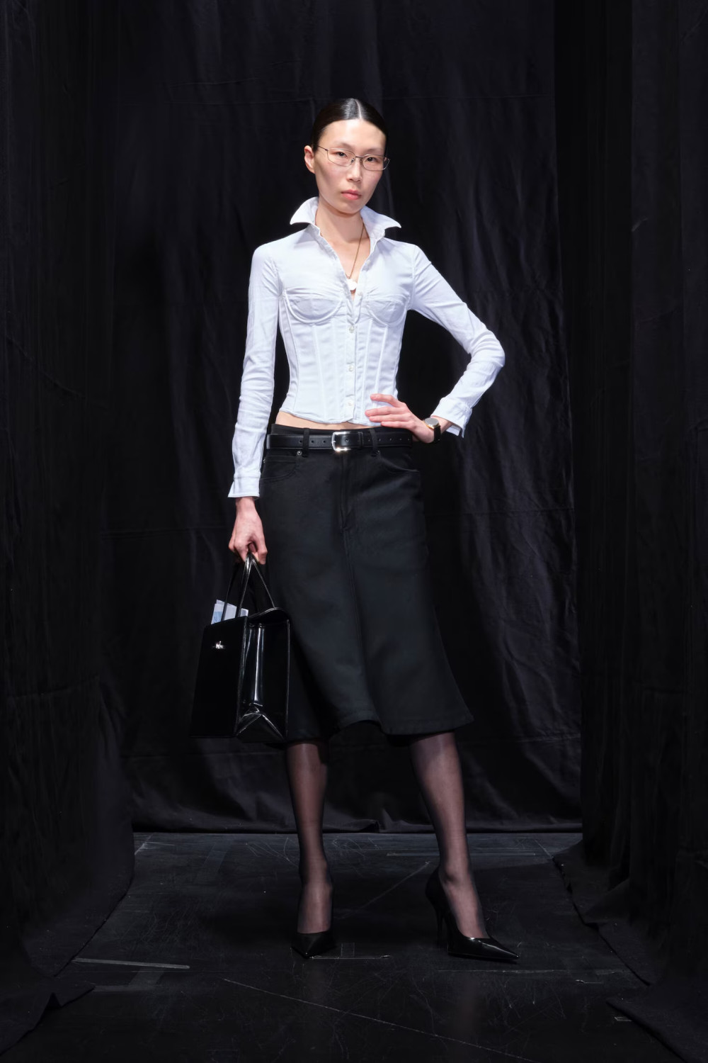 Далее корпоративная эстетика, на первый взгляд строгая и сдержанная, постепенно приобрела более дерзкий и многослойный характер. Одна из моделей продемонстрировала длинное пальто с драпировкой, другая — рубашку, преобразованную в скульптурный корсет. Этот элемент оказался удивительно универсальным: его можно носить как самостоятельное мини-платье или дополнить им джинсовый комплект для создания эффектного образа.