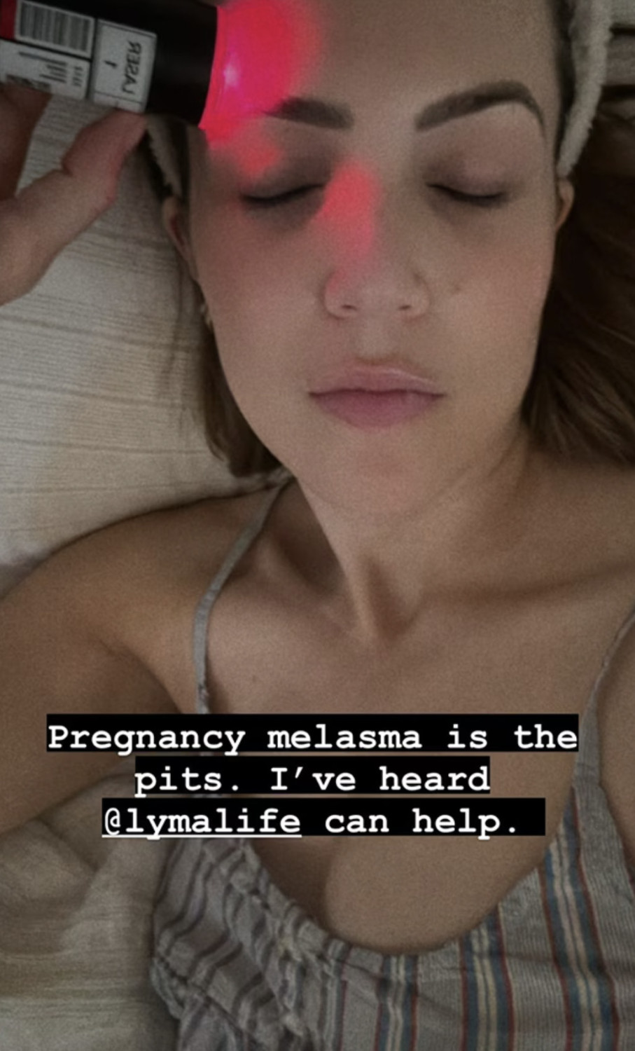 На снимке Мэнди лежит с закрытыми глазами, потирая висок аппаратом Lyma Laser, предназначенным для косметического ухода за кожей.