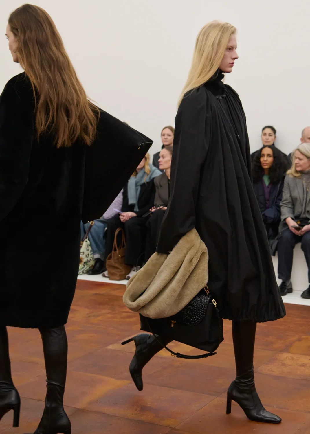 Toteme сделала ставку на современные силуэты, предлагая объемные верхние вещи — кожаные, меховые и нейлоновые пальто-коконы, которые гармонично сочетались с облегающими платьями, карандаш-юбками и брюками. «В этом сезоне мы либо предлагаем широкие брюки, либо обходимся без них вовсе», — заметила Клинг, намекая на контрастные пропорции коллекции.