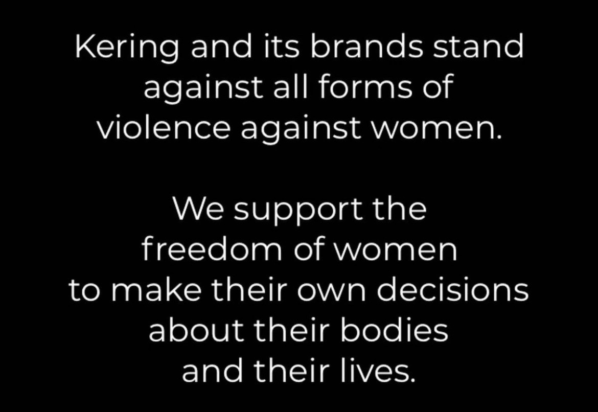 "Kering и ее бренды выступают против всех форм насилия в отношении женщин. Мы поддерживаем свободу женщин принимать собственные решения относительно своего тела и своей жизни",