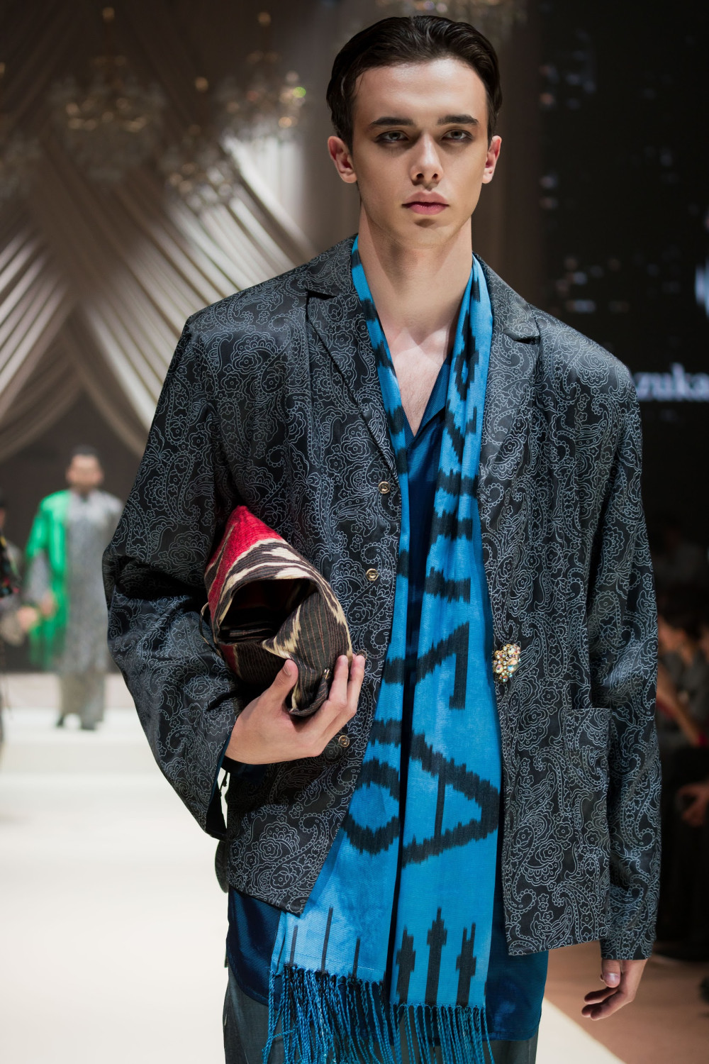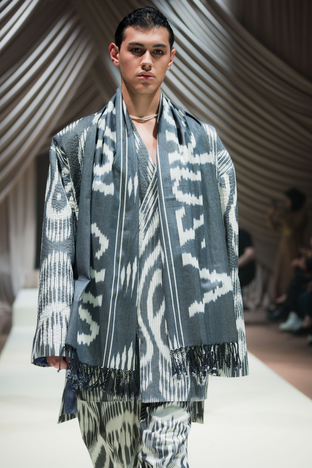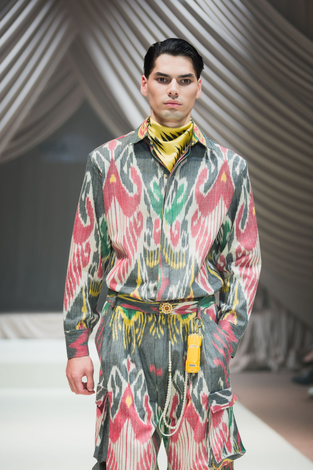Говоря о мужской линии, то она воплощает в себе огонь, живущий в каждом жителе мегаполиса. От пижамных костюмов в полоску до пиджаков и пальто с изображением иката — он уверен в себе и своих стилевых предпочтениях. Отдельного внимания заслуживают яркие шарфы, обвивающие талию или накинутые на плечо, которые добавляют герою бренда неповторимый шарм и завершают его образ.