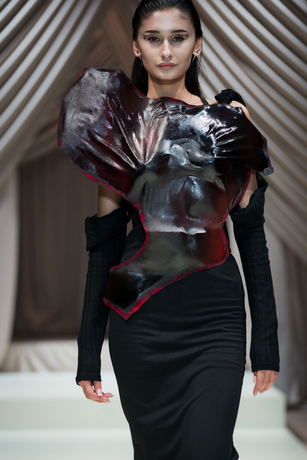 Футуристические формы, такие как коннекторы, сосуды и корни деревьев, символизируют связь человека с Истоком, отражая не только эволюцию человеческого сознания, но и слияние технологий с органическим. В этом контексте классические материалы — кожа и хлопок — гармонично сочетаются с мрачной эстетикой dark futurism, создавая эффектный визуальный нарратив о слиянии прошлого и будущего. Юбки-брюки, выполненные из двух материалов, костюмы с наружными швами и пальто, украшенные корсетом, подчеркивают философский подход, где мода становится не просто одеждой, а концептуальным арт-объектом.