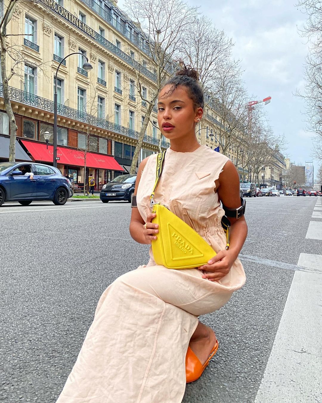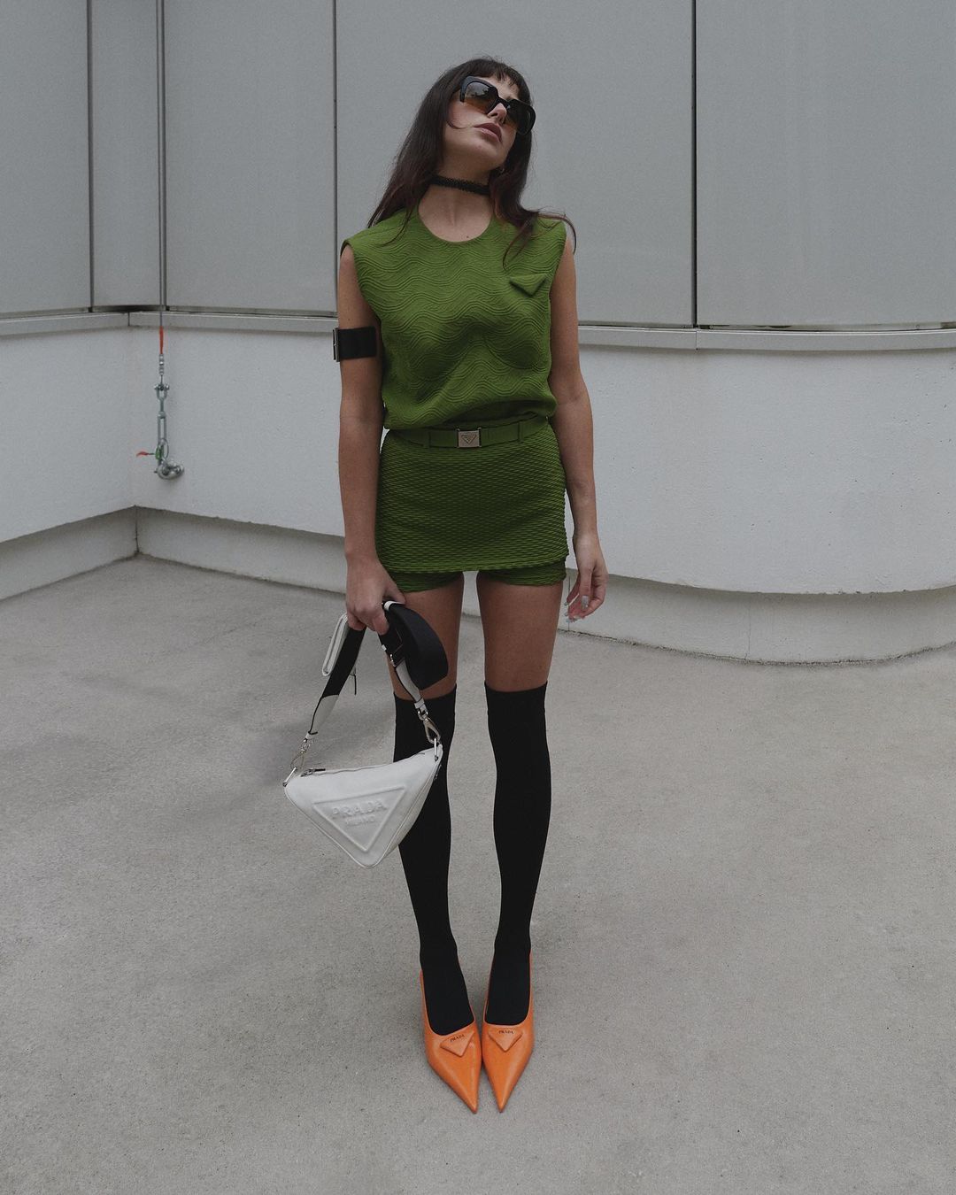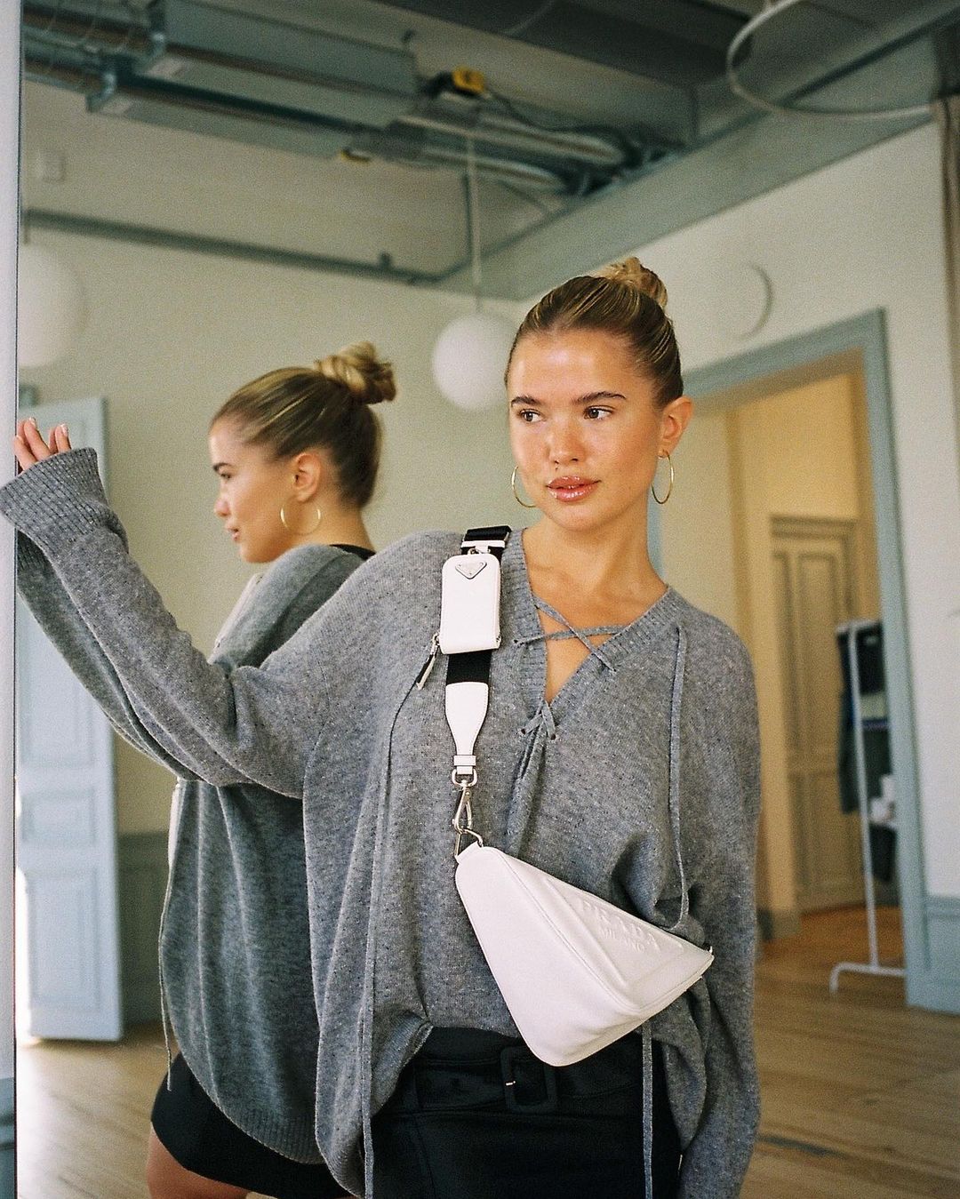 Сумка от Prada. С чем носить? Да с чем угодно! С объемными свитерами и мини-юбками, с кожаными куртками и грубыми ботинками, с платьями и рубашками. Отличные сочетания и образы демонстрируют модные инфлюенсеры. Вдохновляемся.
