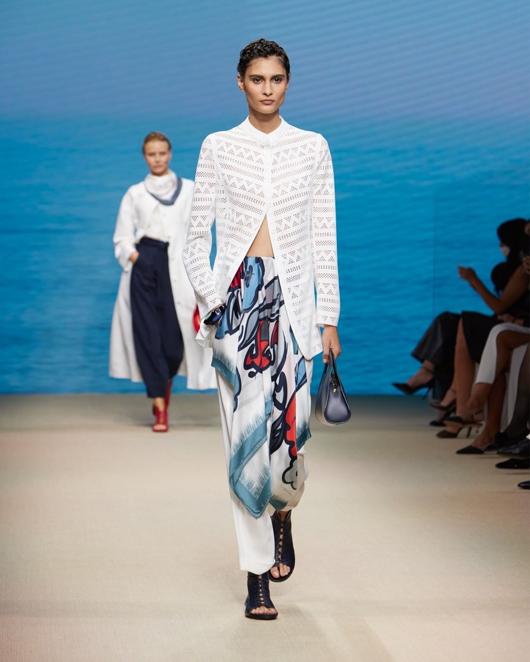 Джорджио Армани представил коллекцию "Весна-Лето 2022" на неделе моды в Милане. Образы, представленные во время показа как будто отсылают к летнему вечеру на морском побережье во время - костюмы, топы и платья оттенка малинового заката смешиваются с кобальтовым цветом вечернего моря. Невесомые платья и юбки из тюля, украшенные блестками так и призывают сиять и бежать навстречу ночному морскому бризу, развеваясь изо всех сил. Юбки в пол дизайнер предлагает носить с жилетами, расшитыми стеклярусом.