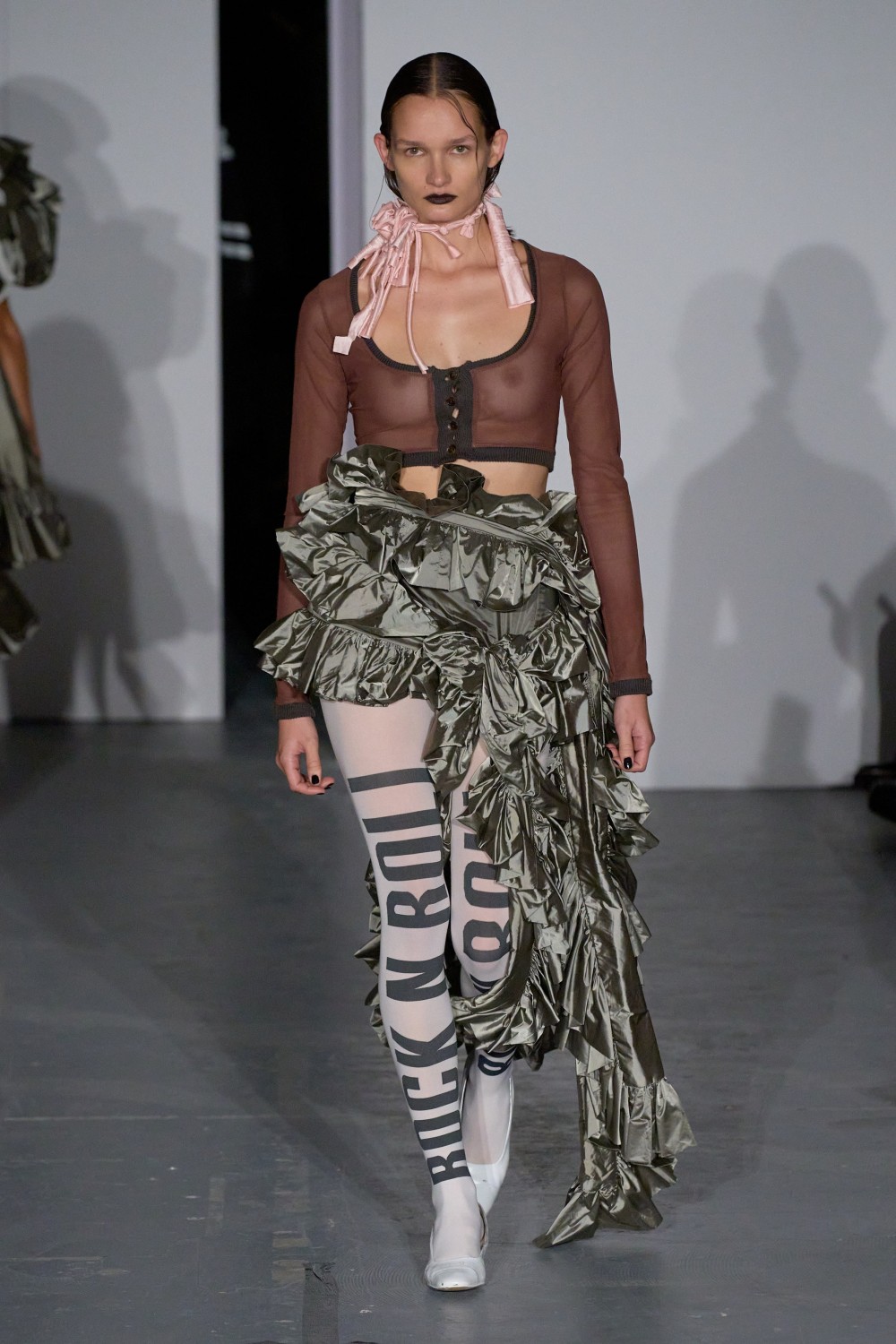 Эклектика буквально заполонила одежду. Отдельно следует отметить бюстгальтер-пулю и платье с американским флагом. Это уже второй показ бренда, и смело можем утверждать, что Vaquera привносит бунт в индустрию, и с этими нарядами можно рассказывать истории.