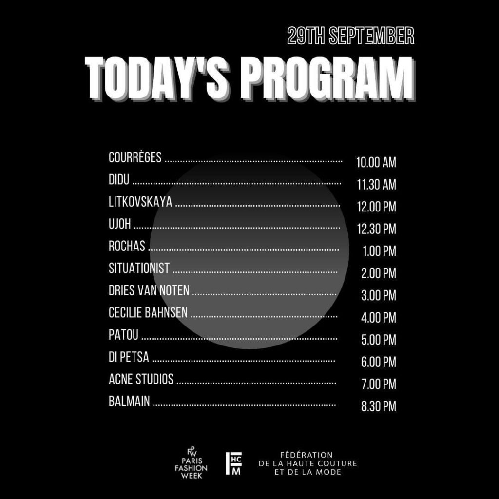 В Париже началась неделя моды. Сегодня, 29 сентября, во третий день модного марафона свои коллекции сезона «Весна-Лето 2022» покажут такие марки, как Courreges, Didu, Litkovskaya, Ujoh, Rochas, Situationist, Dries Van Noten, Cecilie Bahnsen, Patou, Di Petsa, Acne Studios, Balmain.