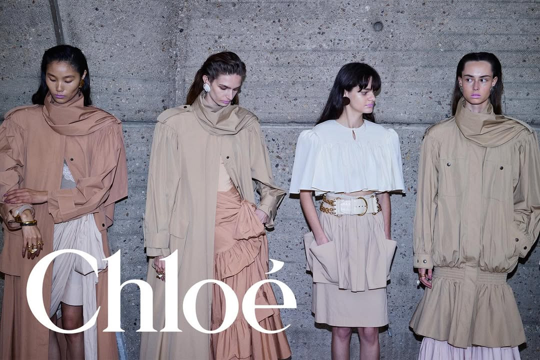 Затем, после цветочного вихря, подиум успокоился и погрузился в мягкую гамму песка, молока и кофе — знаковых тонов Chloé. В этой палитре были выполнены пальто с воланами, многоярусные юбки и укороченные блузки с рукавами-буфами.