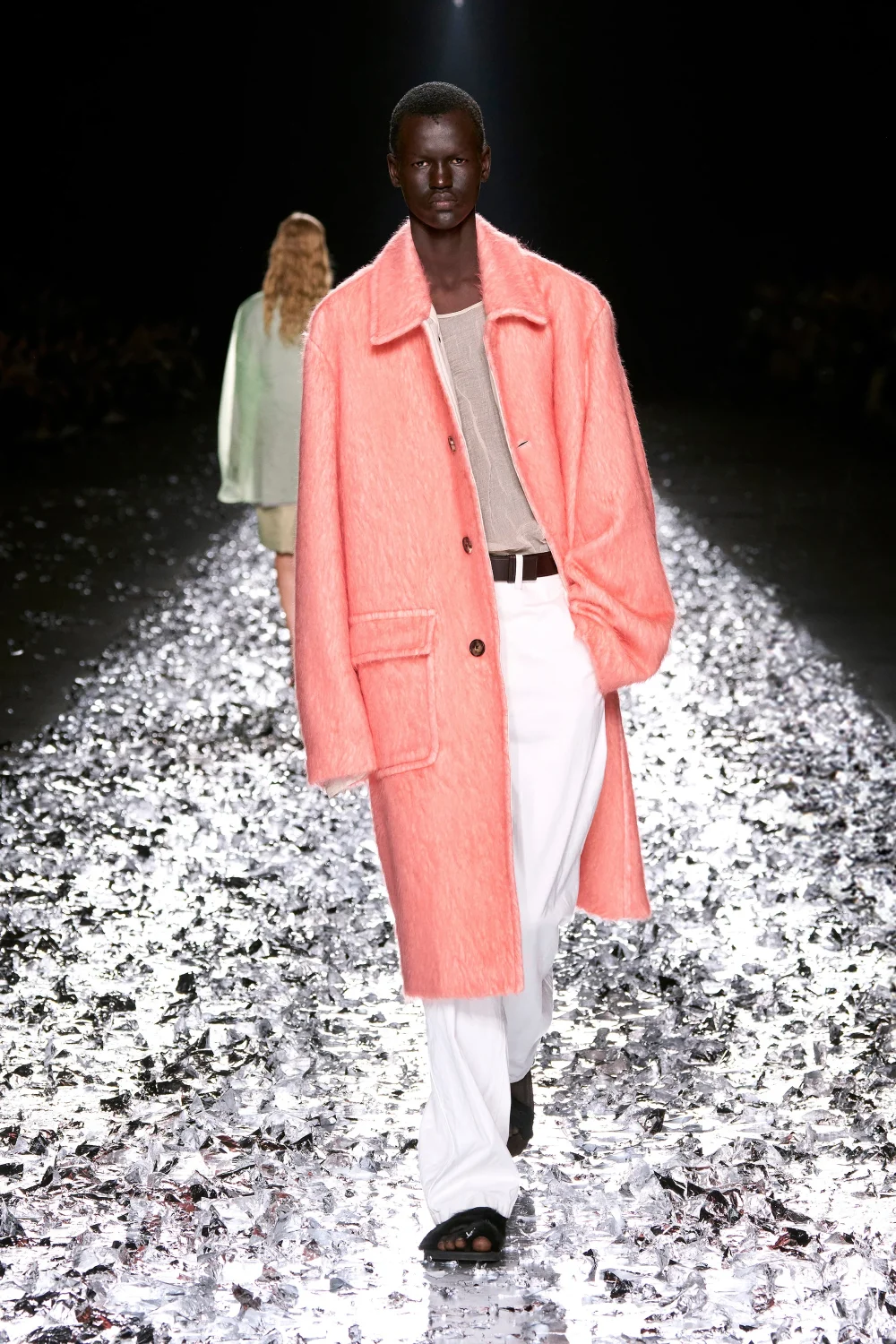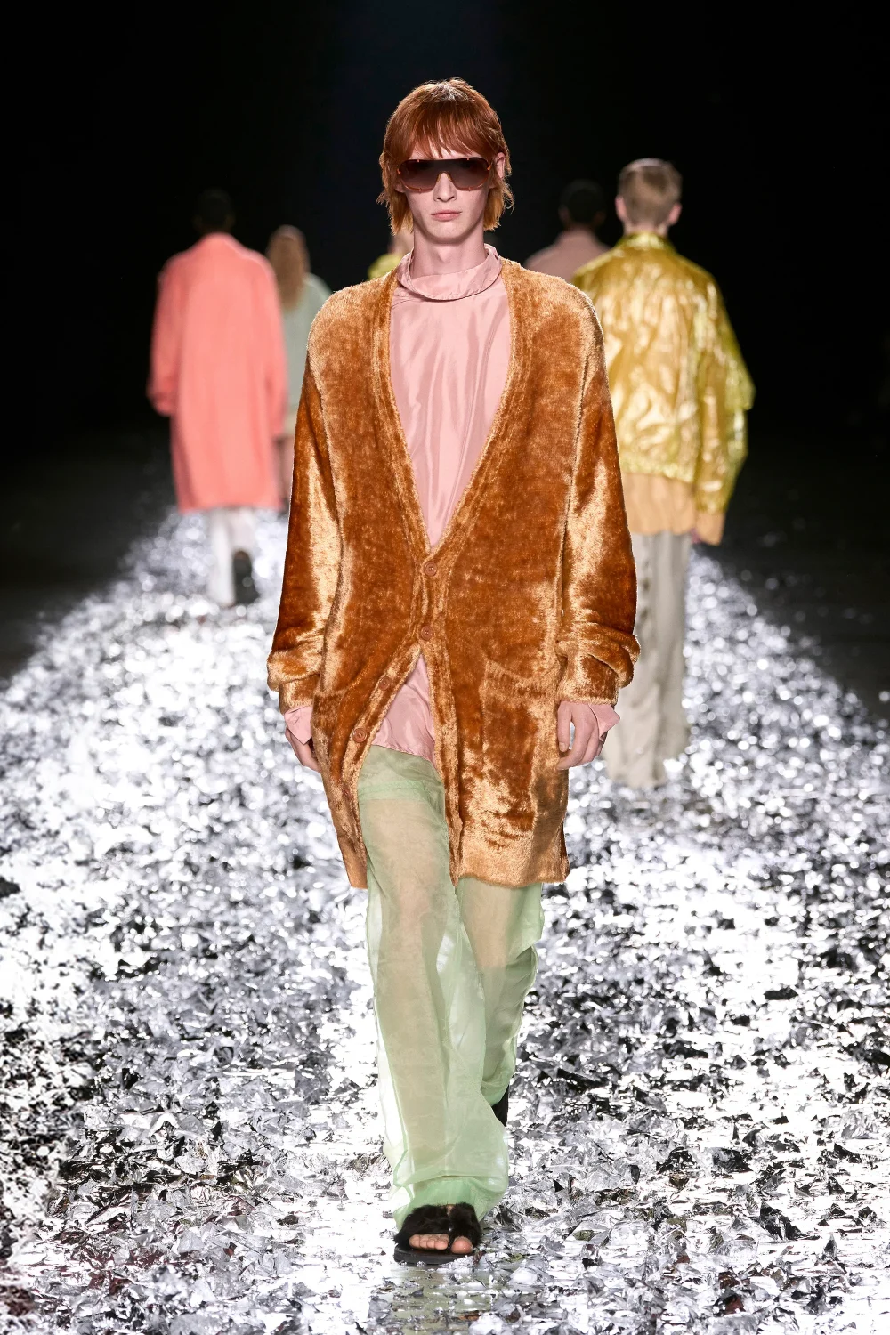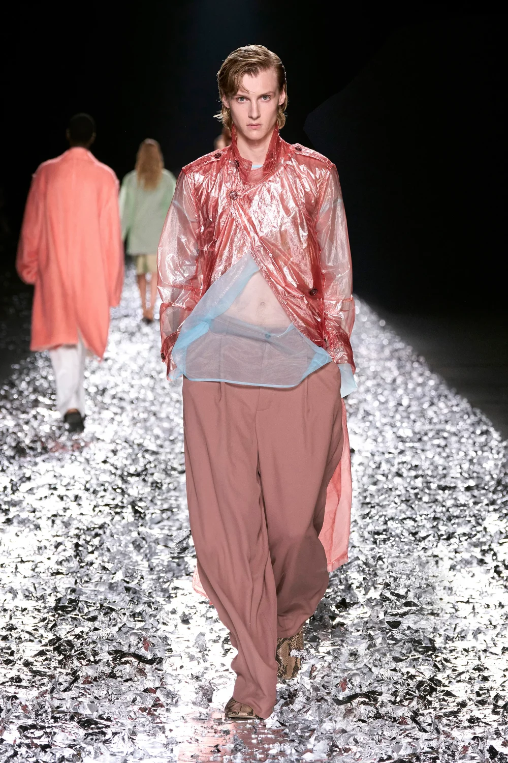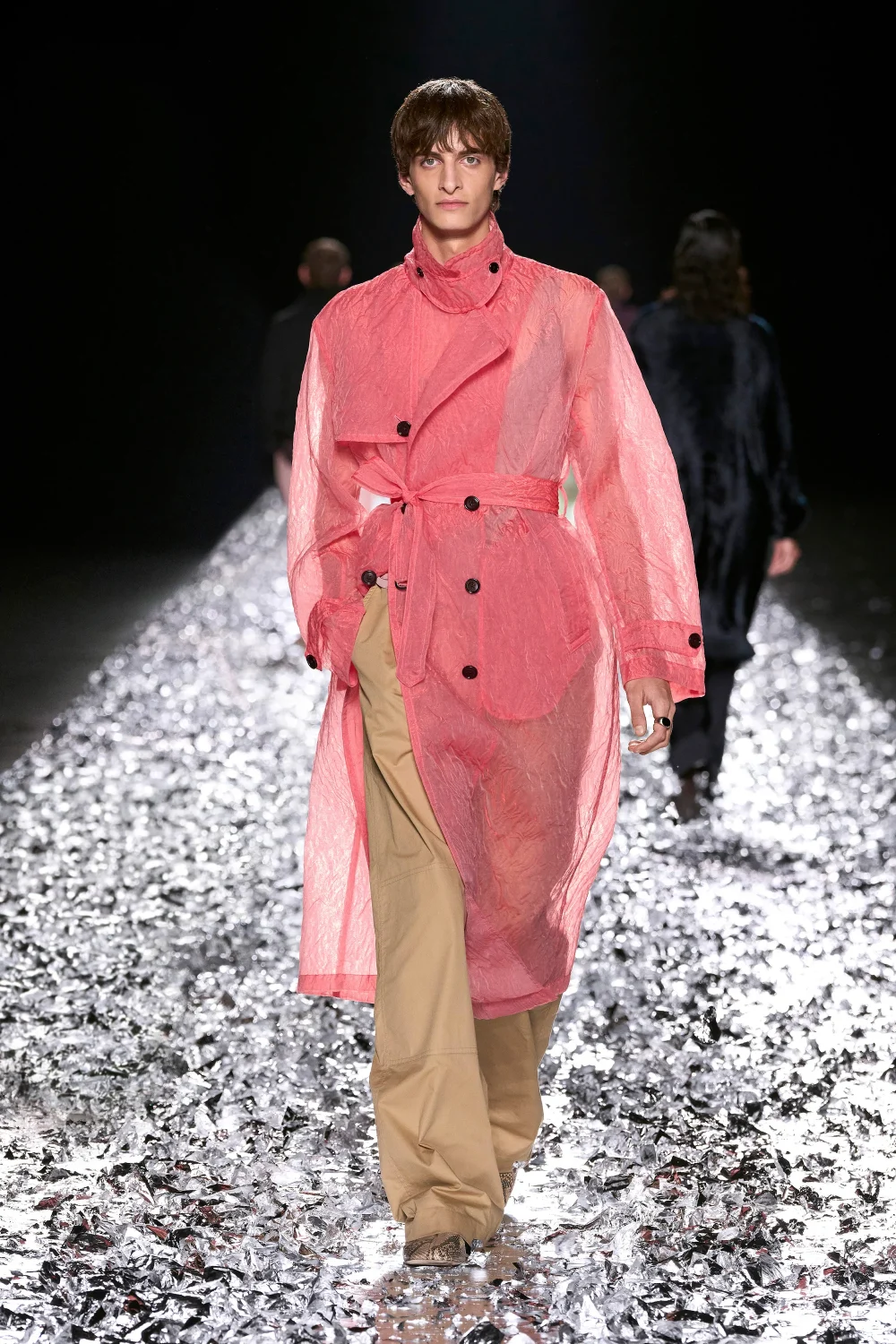 Тренчкоты из цветного целлофана, напоминающего фантики от конфет, а также блестящие пиджаки и брюки, чьи текстуры походили на фольгу, — Ван Нотен черпал вдохновение в работах бельгийской художницы-концептуалистки Эдит Декиндт. Большая часть ее произведений посвящена трансформации повседневных предметов путем воздействия на них воды, химикатов или воздуха в течение долгого времени. «Она много работает с прозрачностью, использует материалы, которые запечатлевают воспоминания, и ткани, которые изнашиваются», — сказал дизайнер перед показом.