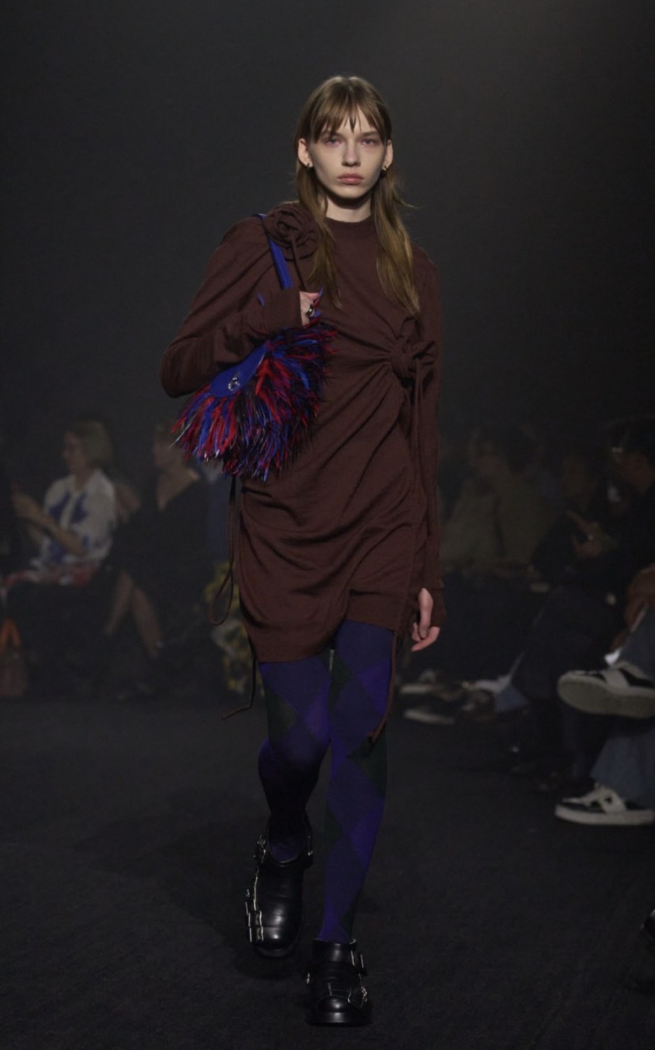 Охотничья эстетика, чав и панк-культура — в коллекции было легко заметить оды культурно значимым британским мотивам. Безумная эксцентричность англичан превратилась в фэшн-приманку для модниц по всему миру. Дэниэл Ли хотел передать сумасшедшую культурную самобытность посредством коллекции — у него это отлично получилось. Когда британцы сталкиваются друг с другом во время ливня, они обмениваются на протяжении многих поколений забавным приветствием «Прекрасная погода для уток!». Дизайнер в дебютной коллекции решил осмыслить эту идиому и представил обилие утиного принта. К тому же, он знает, как создавать всеми желанные аксессуары. Туфли с пушистыми меховыми каблуками, вязаные грелки, массивные шапки и сумки, украшенные словно хвостами животных, — на подиуме модели были обвешаны игровыми атрибутами.