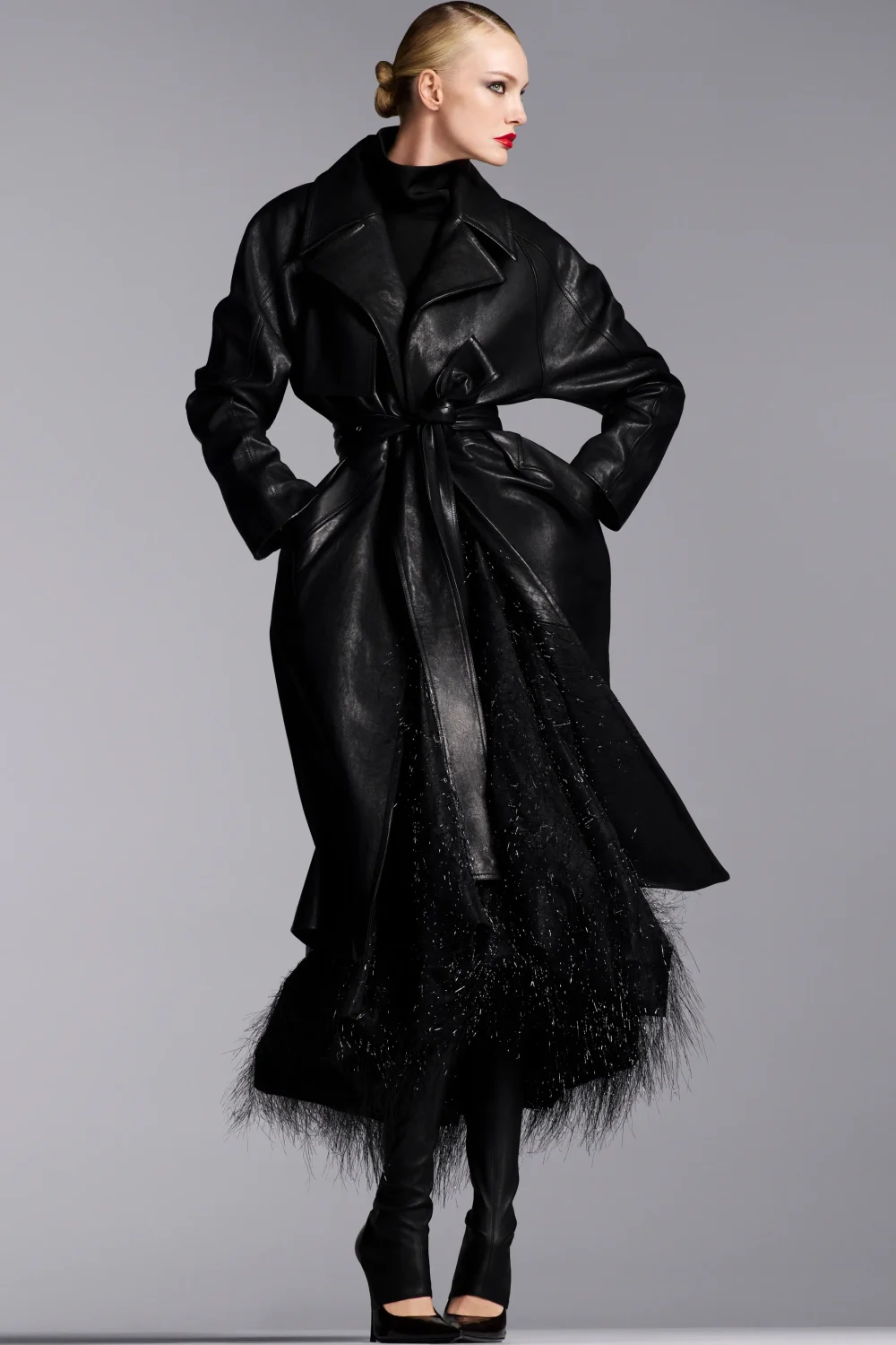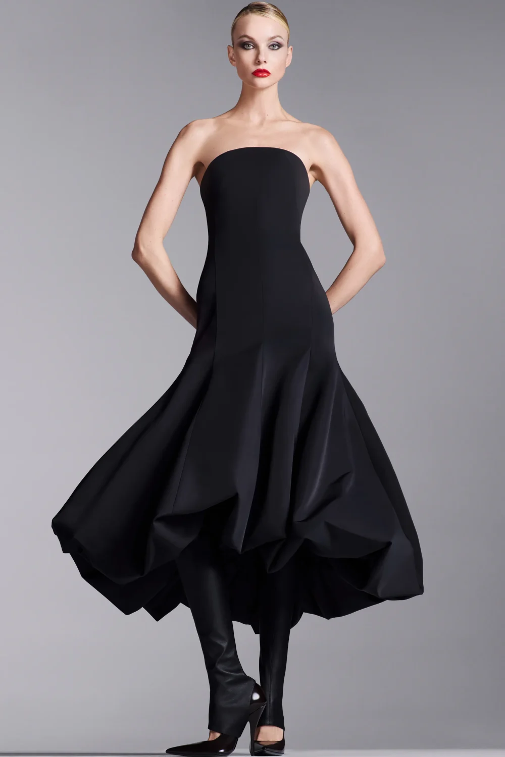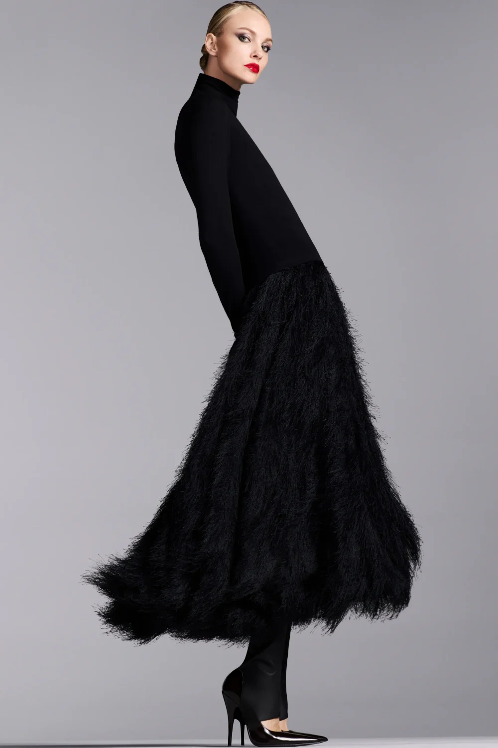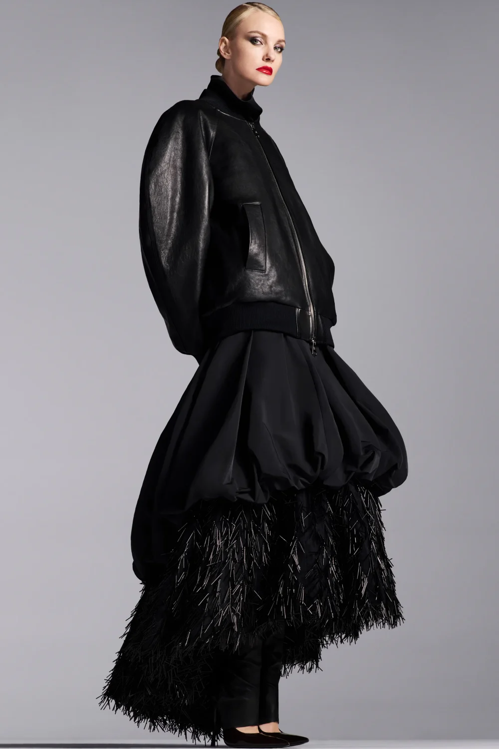 От шарообразных юбок и платьев до объемных пальто — Капальдо вышел за рамки привычной утонченности и представил максимально экспрессивные формы. Среди других знаковых элементов: шелковые водолазки без рукавов, юбки с пейсли-узором, расшитые блестками, а также кожаные мини-шорты.