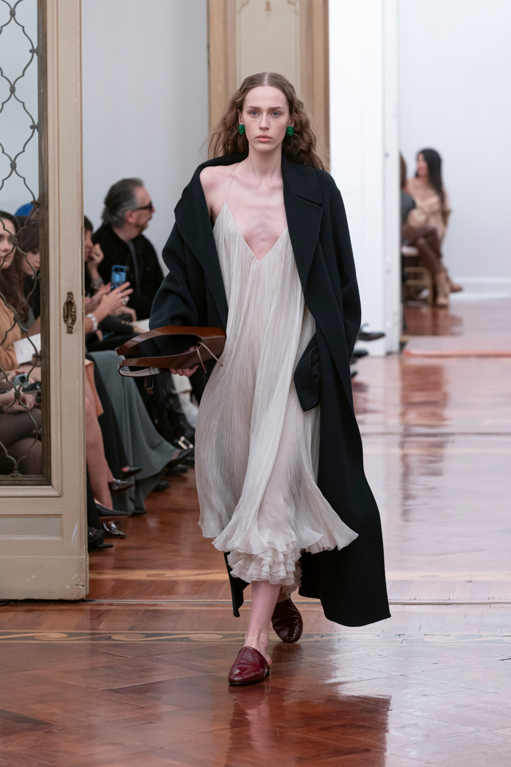 Показ прошел в Palazzo Donizetti — месте, которое когда-то видело не одно шоу Ferretti, но в последние годы оказалось в тени. Серафини решил вернуть его в центр событий, тем самым выразив свое уважение к истории Дома. Интимная атмосфера пространства только усиливала чувственность коллекции, названной Progressive Romantics.