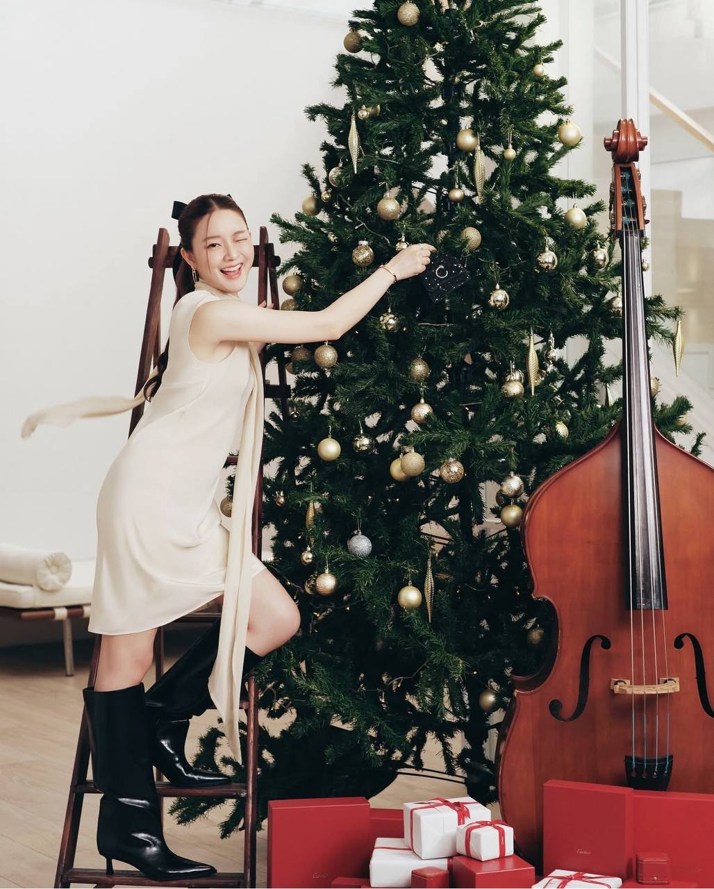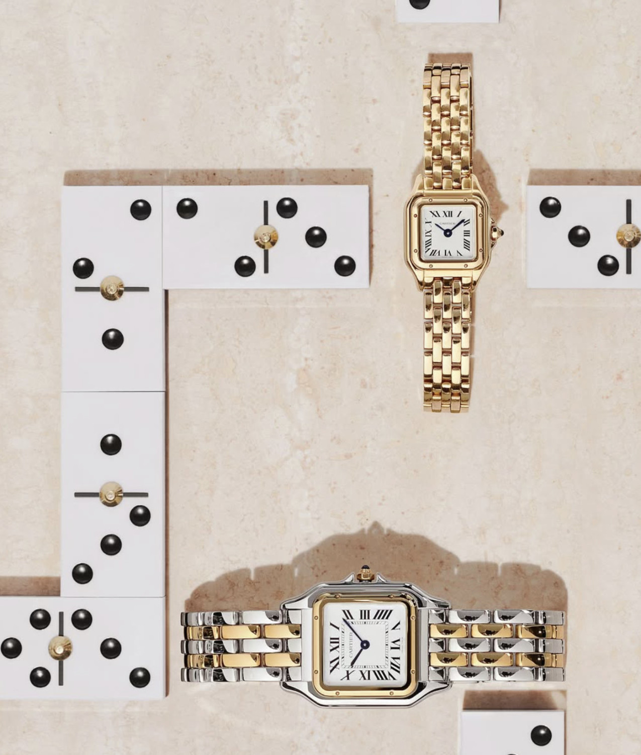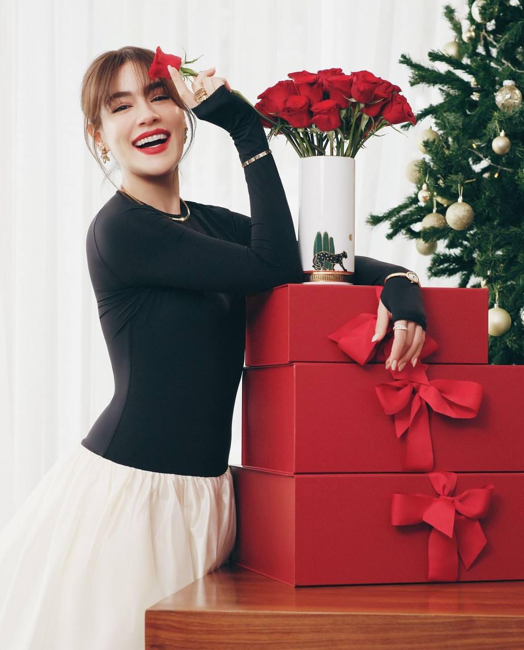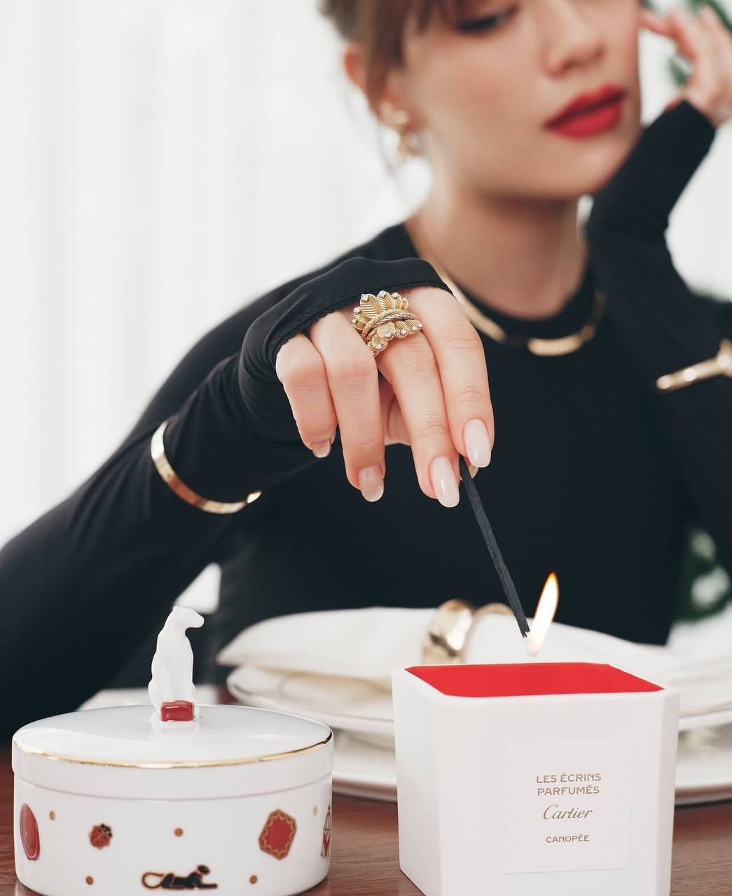 Кимберли предстала в классическом черно-белом платье, изящно дополненном браслетом и колье из коллекции LOVE, кольцом Trinity, серьгами и кольцом Grain de Café, а также часами Baignoire в миниатюрной версии. На фоне фарфорового набора Panthère de Cartier и ароматической свечи Les Écrins Parfumés она воплощает идеальный образ хозяйки новогоднего вечера.