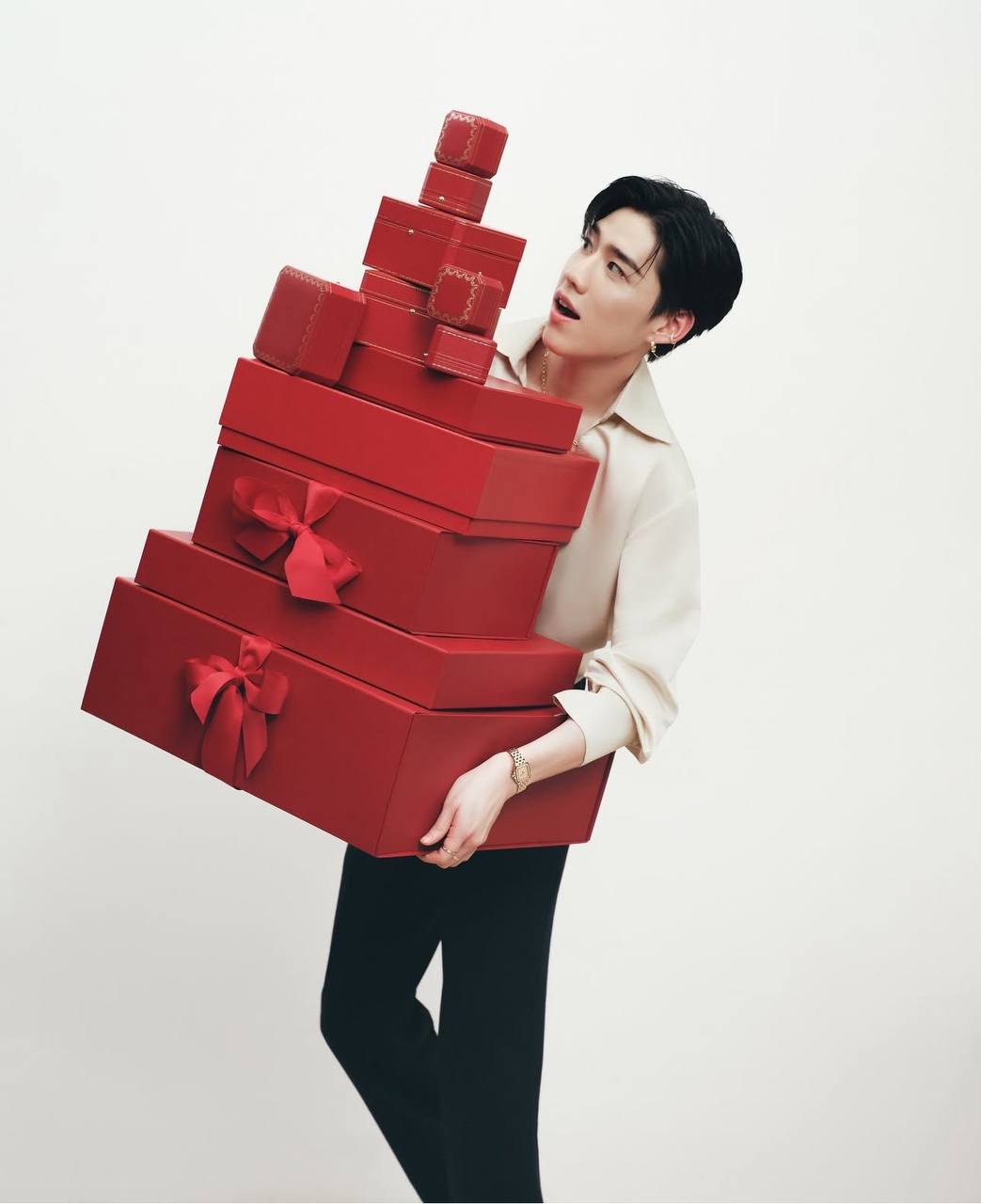 Джефф выбрал бордовый наряд, который идеально гармонировал с теплыми оттенками его аксессуаров. Его запястье украсил браслет Juste un Clou, а кольцо Trinity и часы Panthère de Cartier в розовом золоте добавили изысканного блеска. Свою праздничную магию он создает, играя в карты и упаковывая подарки в заветную красную упаковку Дома.