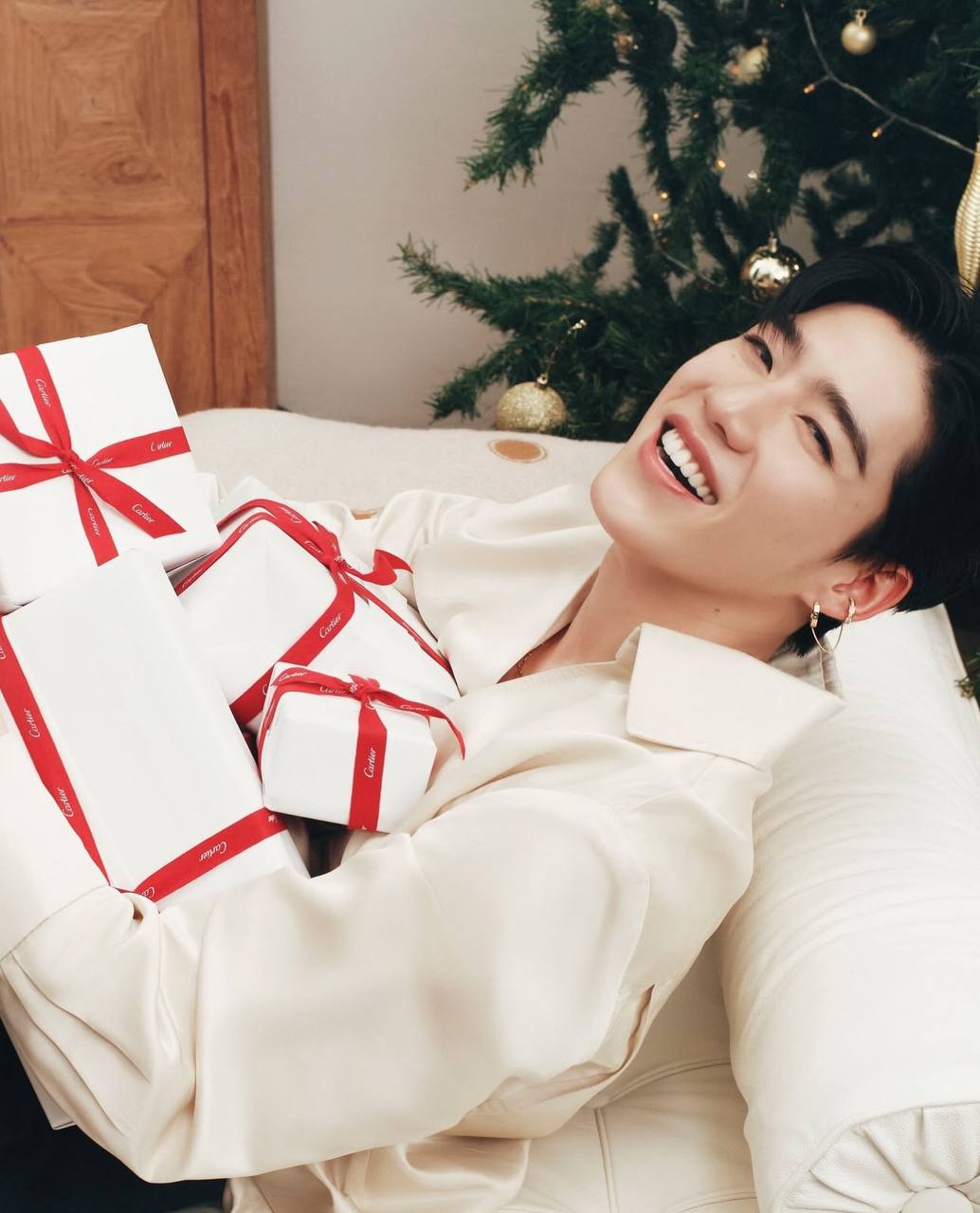 Тор сделал ставку на лаконичный total-black образ, добавив акценты из белого золота. В их числе: браслет и колье Clash de Cartier, кольцо и браслет LOVE, кольцо Juste un Clou и часы Santos de Cartier Dual Time. Завершает картину утонченная деталь — ручка Santos de Cartier, которой он подписывает праздничные открытки.