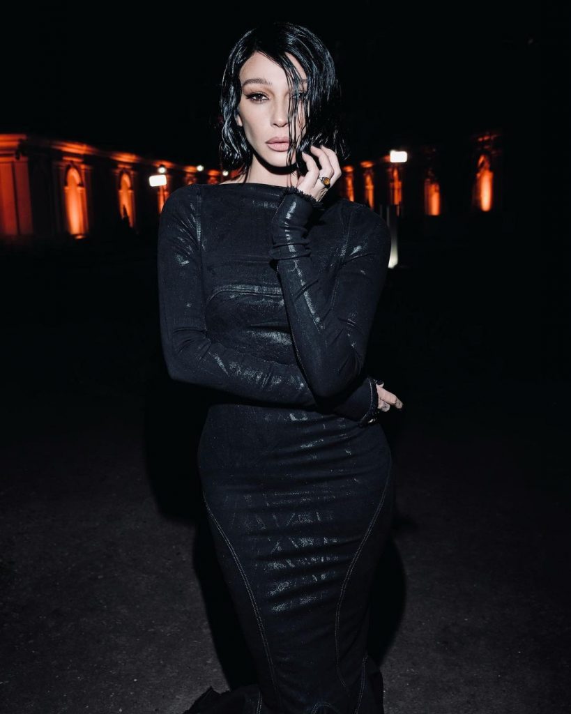 Особое внимание приковал образ Насти Ивлеевой. Для праздника она выбрала роскошный черный наряд бренда Rick Owens, а палец украсило кольцо Rhoe Bermat с желтым сапфиром. Также девушка сменила цвет волос, став жгучей брюнеткой.